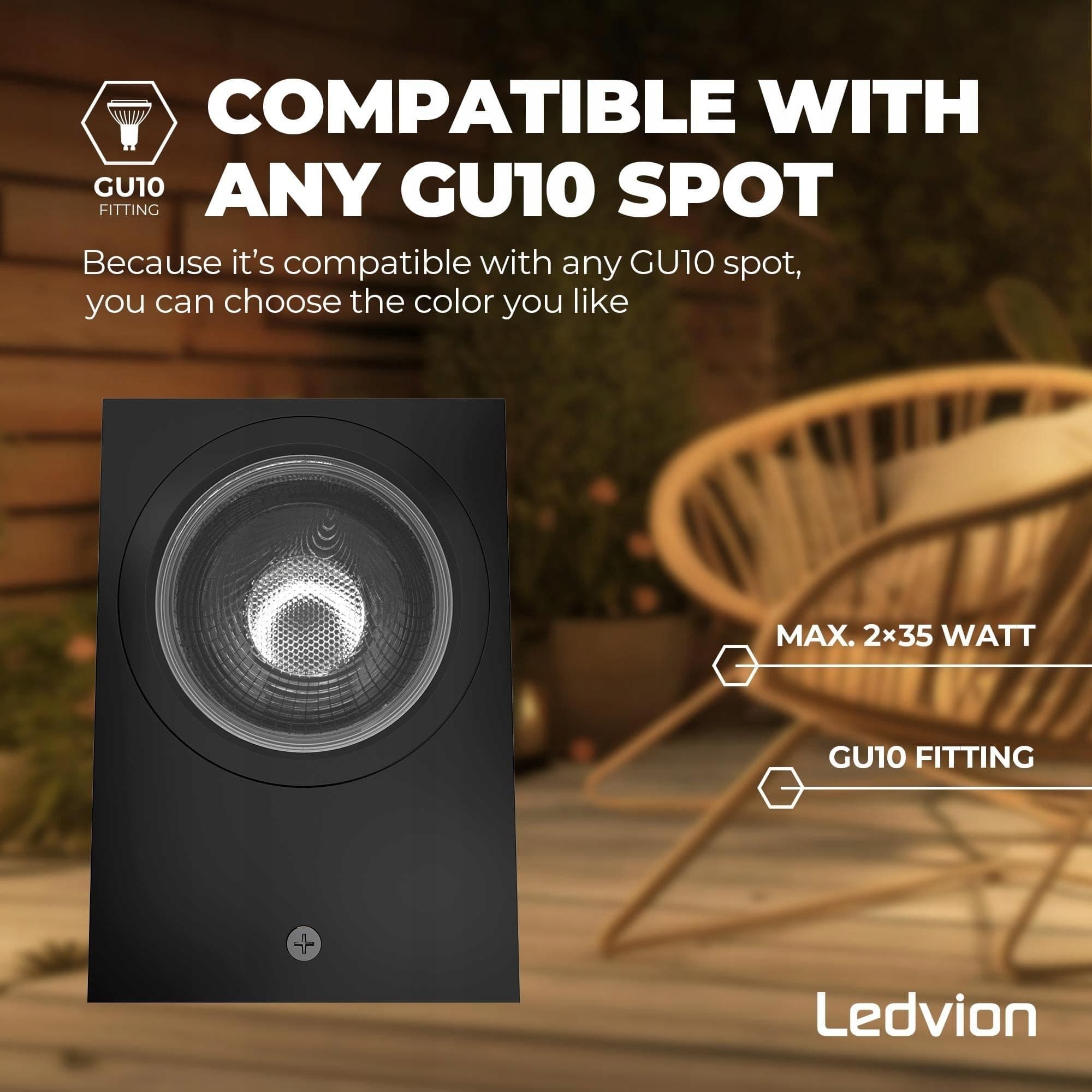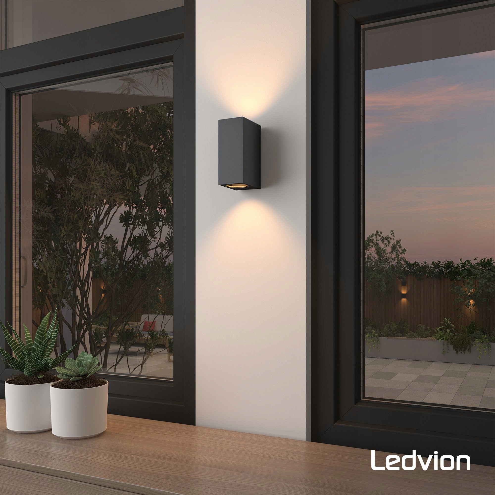 Ta czarna zewnętrzna lampa LED ma dwa gniazda GU10 i tworzy efekt świetlny Up&Down na ścianie. Temperaturę barwową lampy ściennej wybierasz sam, ponieważ nie są dołączone żadne źródła światła LED.