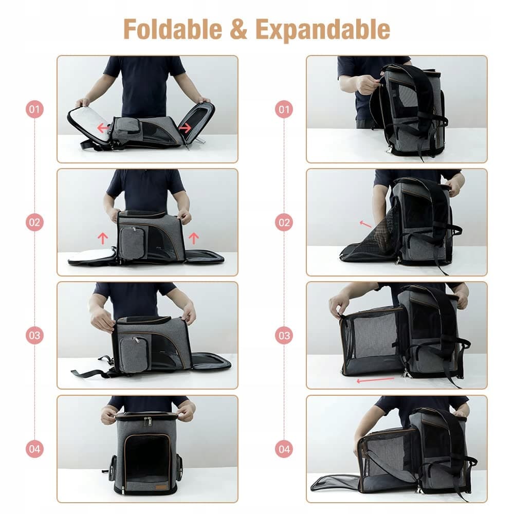 [Rozszerzalny i składany] Ten plecak dla kota ma ekstra dużą, rozszerzalną tylną część, która zapewnia Twojemu zwierzęciu przestronny obszar do aktywności i redukuje lęki. A gdy nie jest używany, można go łatwo złożyć na płasko do przechowywania.