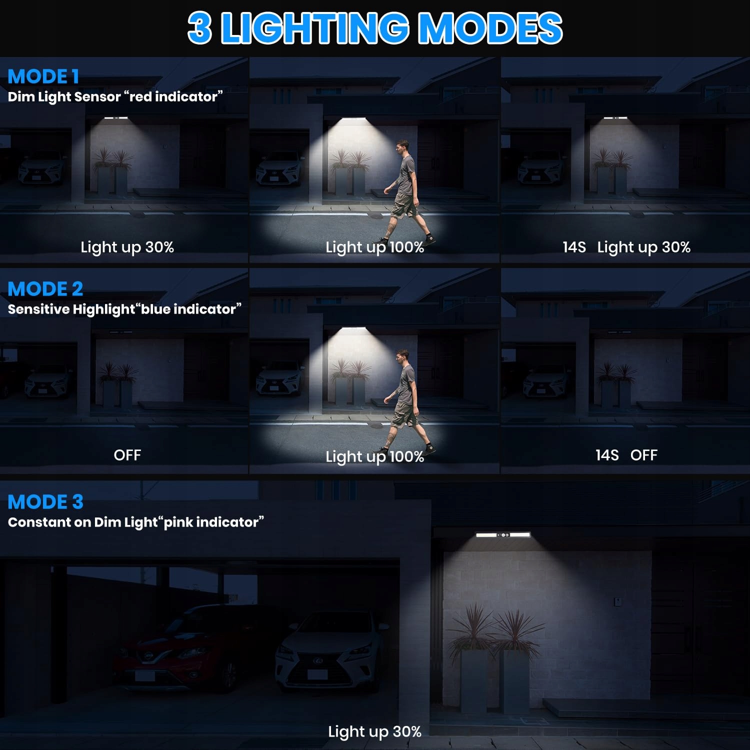 ☀[3 tryby i czujnik ruchu]- Przełączaj się bez wysiłku między 3 trybami światła. 1) Tryb silnego światła z czujnikiem i tryb przyciemnionego światła. 2) Tryb silnego światła z czujnikiem. 3) Tryb ciągłego przyciemnionego światła. Lampa solarna z czujnikiem ruchu może wykrywać ruch do 8 metrów w zakresie 120°, oświetlając wszystko, co się zbliża.