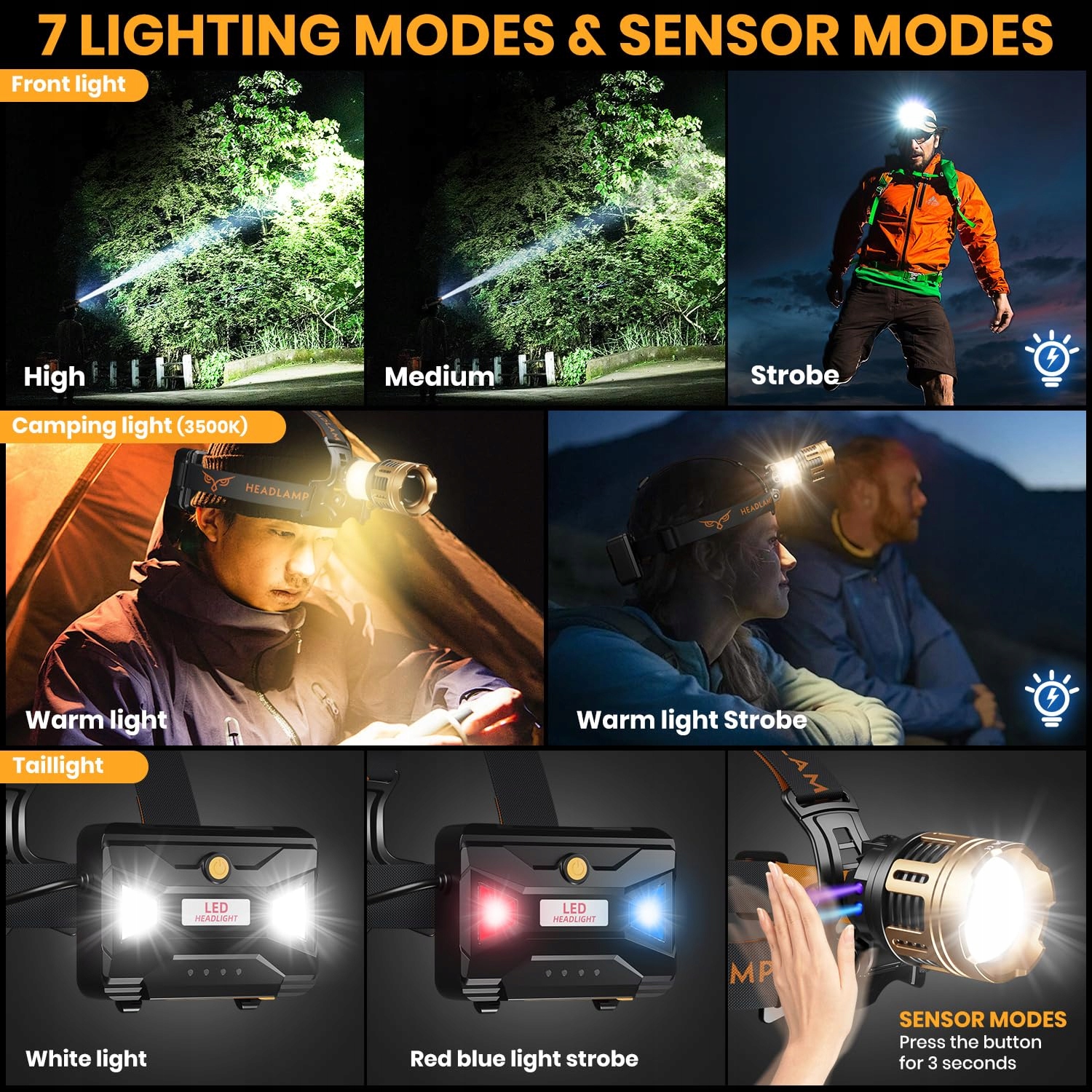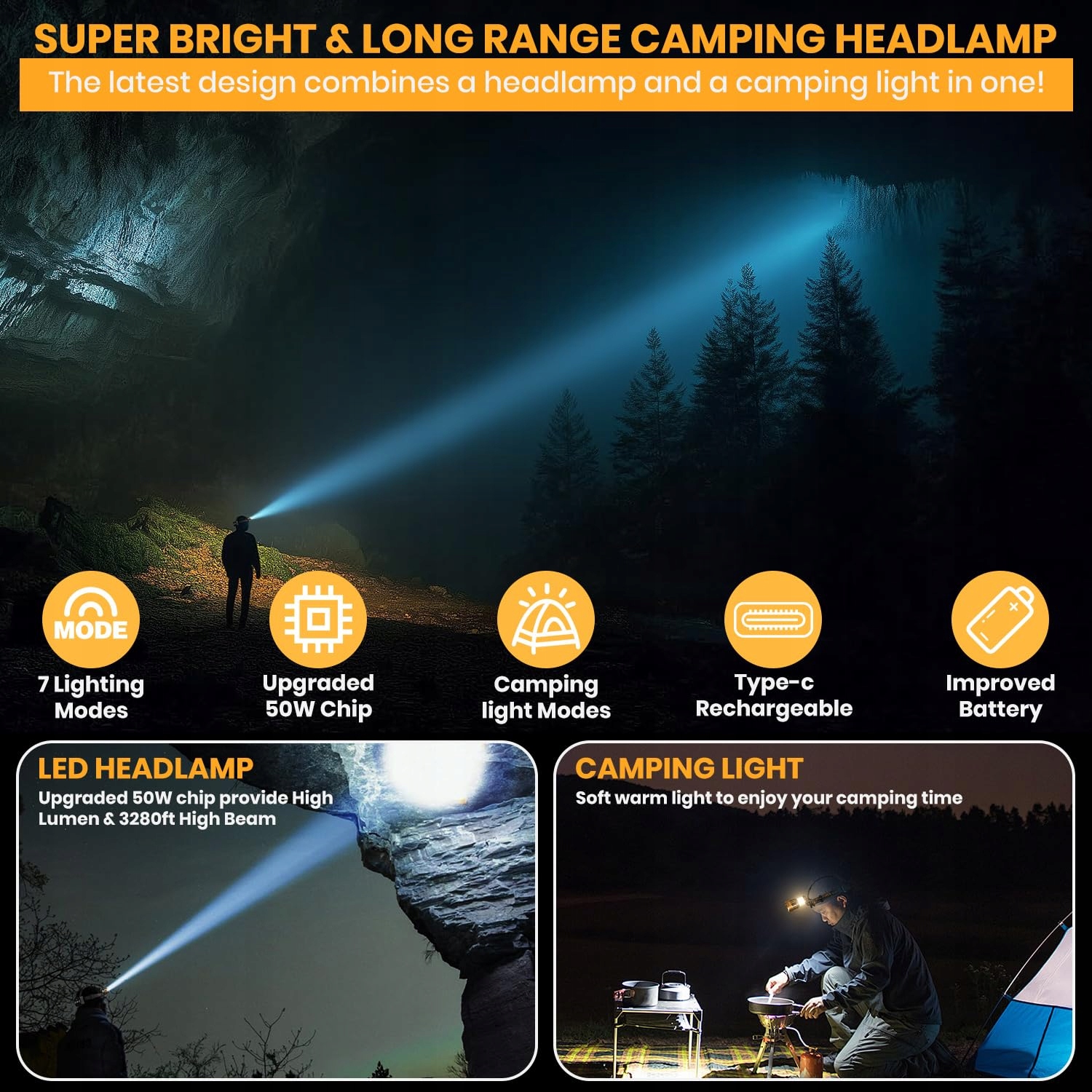 【Nowości LED Latarka czołowa na kemping】 Jedno światło do dwóch zastosowań, idealny partner na zewnątrz! Innowacyjny design sprawia, że nasza latarka czołowa może być używana zarówno jako latarka czołowa, jak i światło kempingowe. Latarka czołowa wykorzystuje zaktualizowane diody LED 50W, wysoką jasność reflektora, ultra daleki zasięg, łatwo oświetla ziarno! Światło kempingowe 360° miękkie światło, oświetlenie i czytanie w namiocie bez oślepiania, długi zasięg, który towarzyszy Ci przez całą noc.