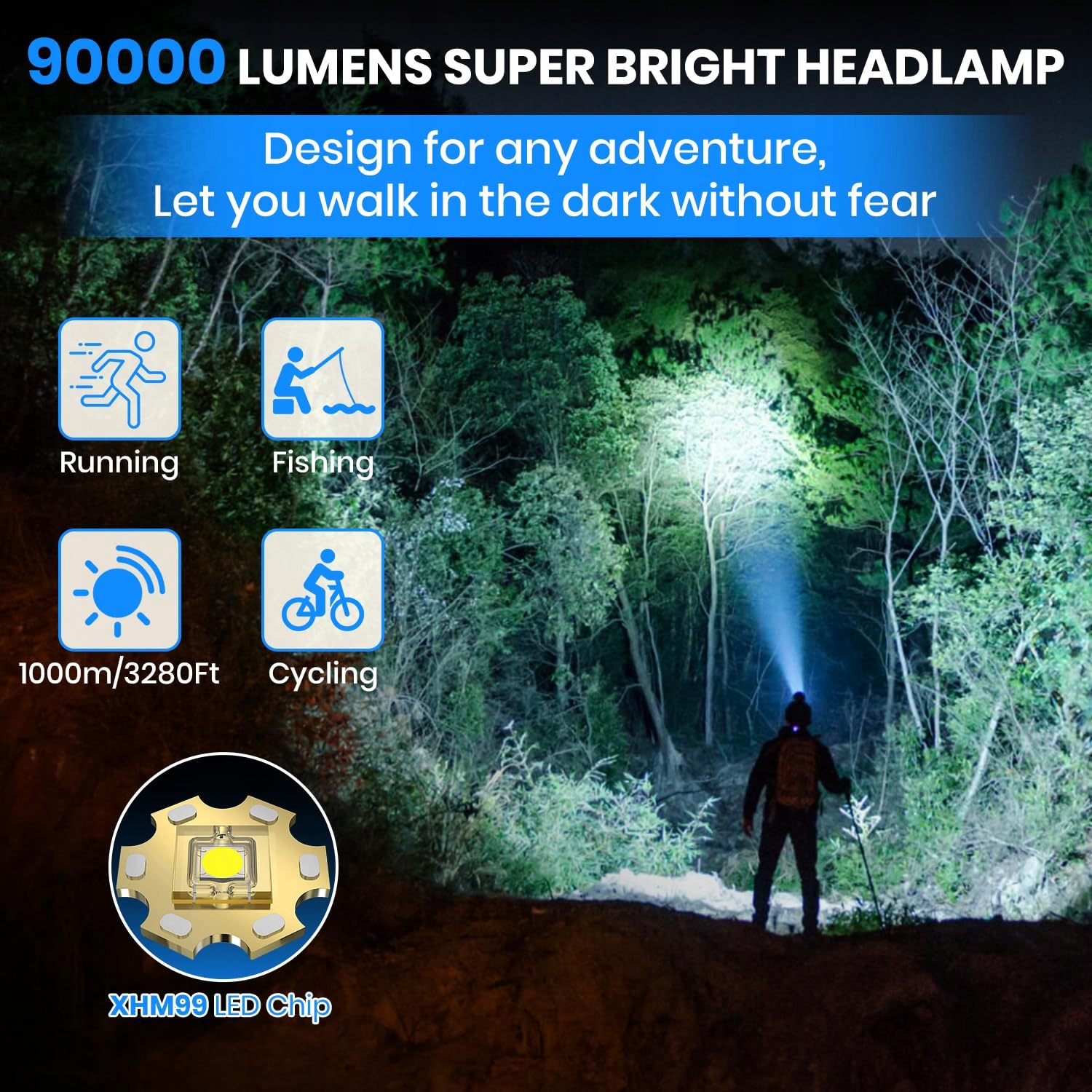 [90000LM SUPERJASNA LATARKA CZOŁOWA] - Dzięki ulepszonemu chipowi LED XHM99, latarka 50W jest jaśniejsza niż reflektory takie jak XHP90, XHP70 i XHP50. To najjaśniejsza latarka na rynku o mocy do 90.000 lumenów; rozkład mocy jest równomierny, a promień jest przenikający, co nadaje reflektorowi większy zasięg do 1000 metrów. To reflektor o wysokiej wartości lumenowej, który może być używany zarówno do zastosowań prywatnych, jak i przemysłowych.