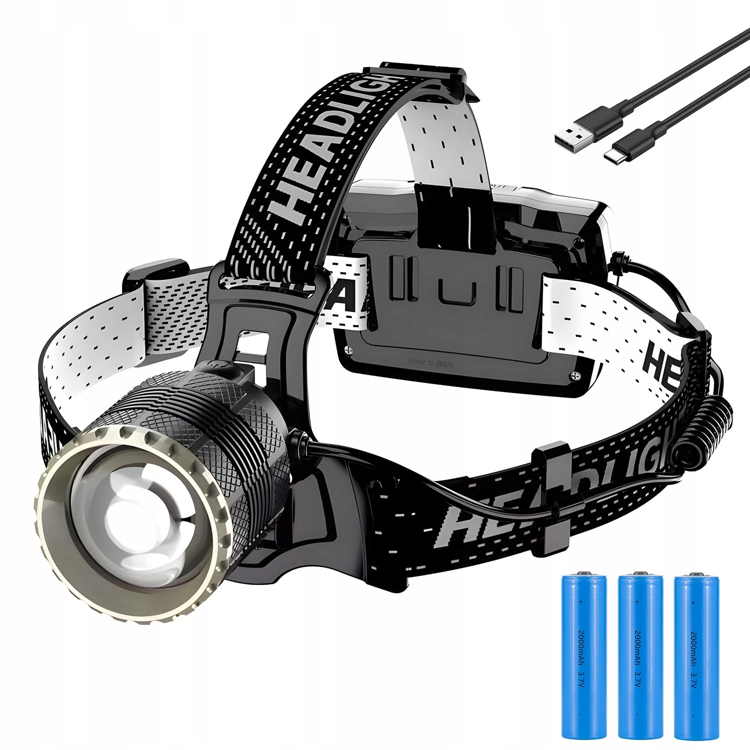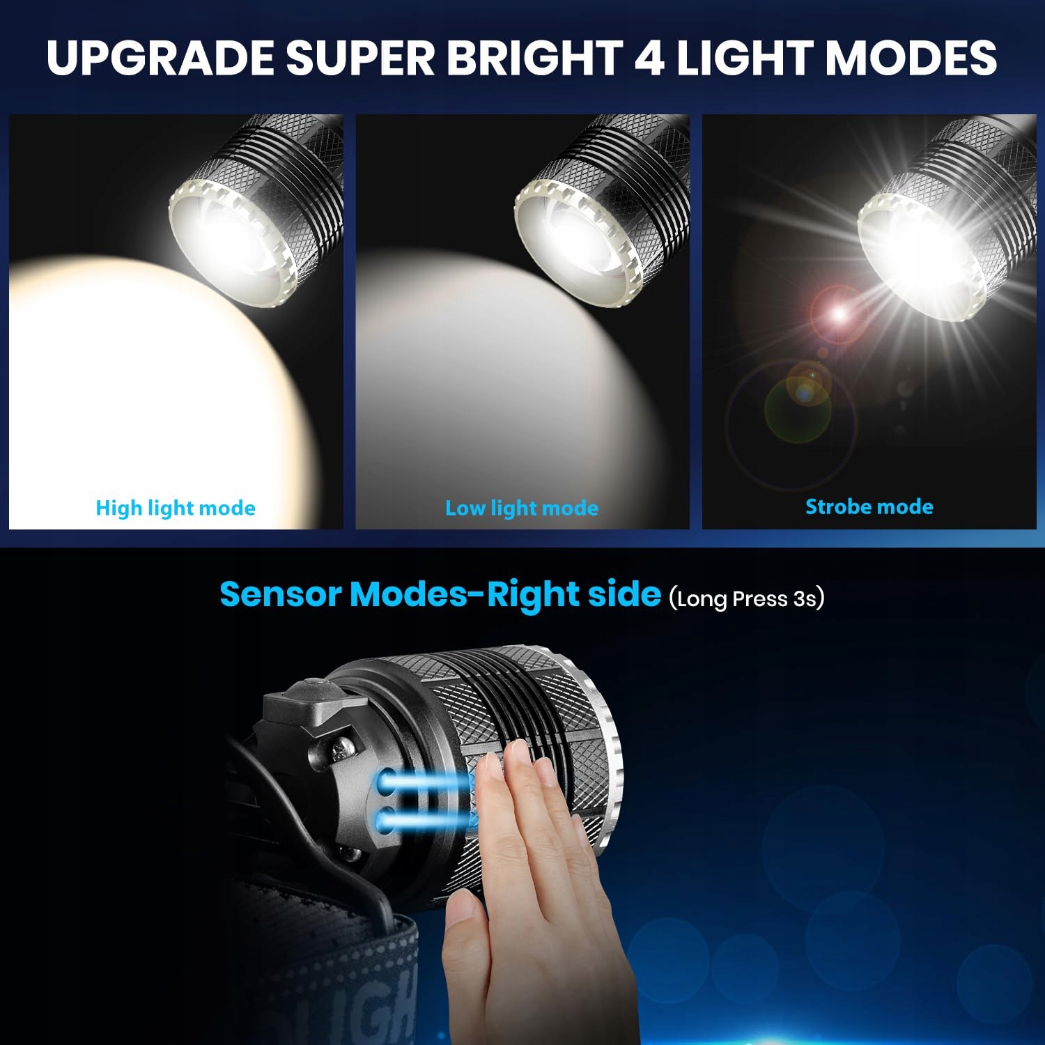 [4 TRYBY I FUNKCJA SENSORA] - Ta ładowalna latarka czołowa oferuje 4 tryby oświetlenia: mocne światło, słabe światło i tryb stroboskopowy, naciśnij przycisk, aby przełączać między trybami według uznania; tryb sensorowy, naciśnij przycisk przez 3 sekundy, aby go włączyć, naciśnij ponownie, aby go wyłączyć, sensor znajduje się po prawej stronie głowy; zmienny tryb zoom, możesz powiększać i pomniejszać, aby ustawić preferowaną pozycję, łatwe w użyciu.