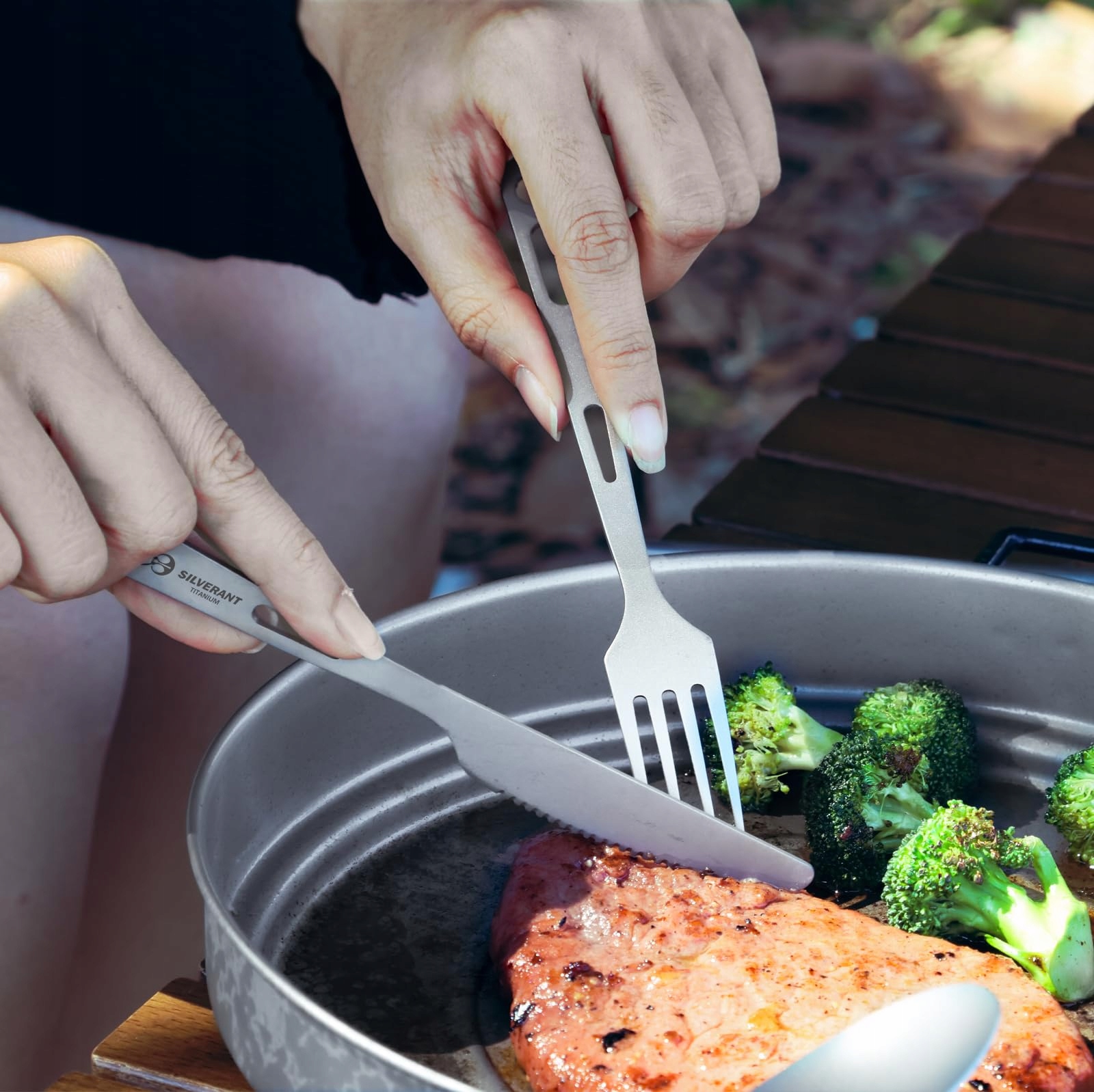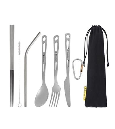 𝐀𝐃𝐕𝐄𝐍𝐓𝐔𝐑𝐄 𝐏𝐑𝐎𝐎𝐅 – Podczas sportów na świeżym powietrzu, kempingu i wędrówek potrzebujesz 5-częściowego zestawu sztućców, który zawsze się sprawdzi. Sztućce SilverAnt z tytanu: widelec, łyżka, pałeczki, nóż i słomka są trwałe na całe życie. Niezależnie od tego, czy przygotowujesz wykwintne danie nad ogniskiem, czy kończysz ostatnie porcje swojego suchego jedzenia – 5-częściowy zestaw naczyń SilverAnt z tytanu jest dokładnie tym, czego potrzebujesz.