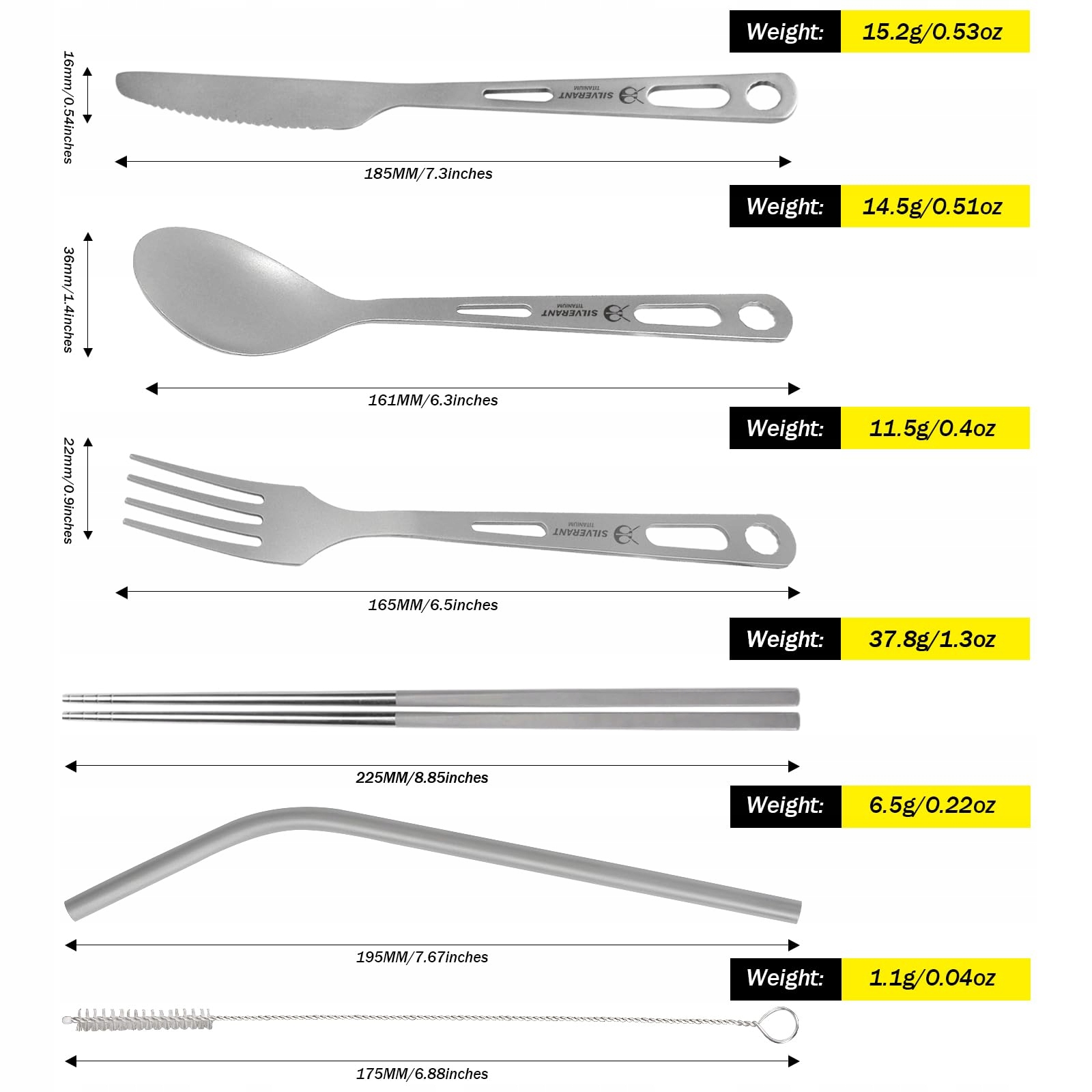 𝐔𝐋𝐓𝐑𝐀𝐋𝐈𝐆𝐇𝐓 & 𝐅𝐔𝐍𝐂𝐓𝐈𝐎𝐍𝐀𝐋 – Tytan jest o 45% lżejszy od stali i jednocześnie bardziej wytrzymały. 5-częściowy zestaw sztućców SilverAnt z tytanu waży łącznie 100 g. Nóż, widelec, pałeczki, słomka i łyżka można po użyciu połączyć razem za pomocą karabinka z tytanu. Ten 5-częściowy zestaw sztućców to także świetny prezent dla wszystkich, którzy codziennie zabierają lunch do pracy. Niektórzy mówią „Everyday Carry”, my mówimy „EDC”.