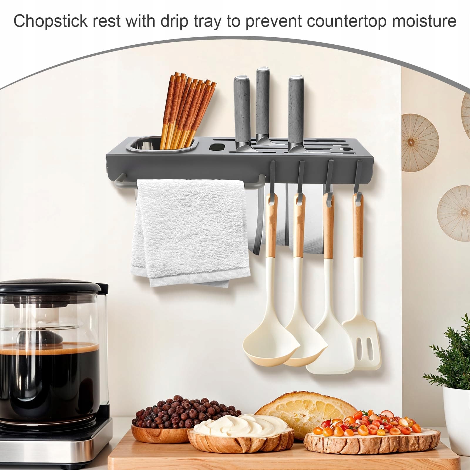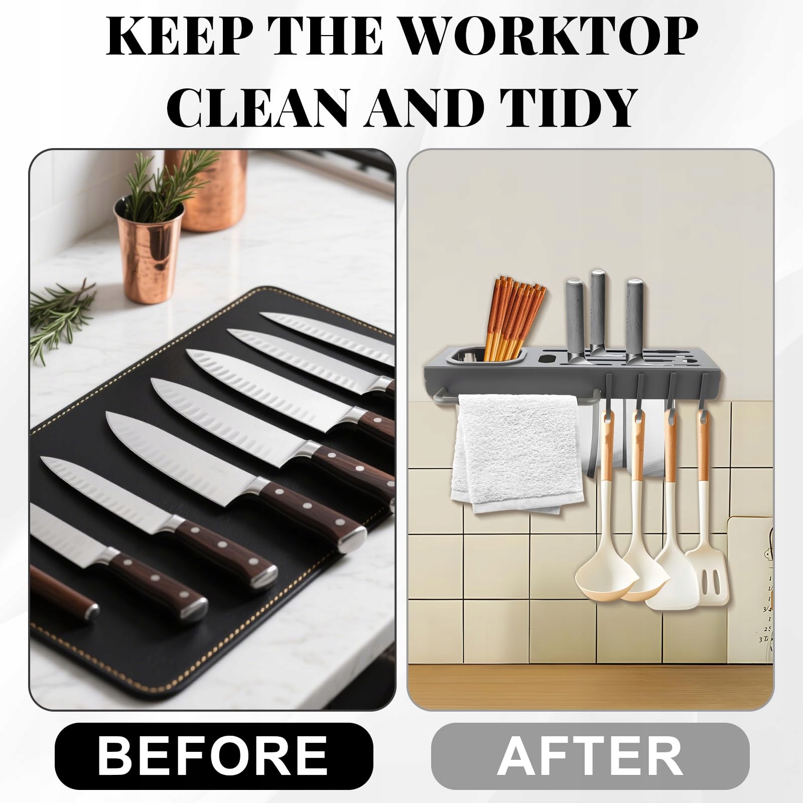 Wielofunkcyjny projekt przechowywania: zestaw noży bez bloku posiada specjalnie zaprojektowane haczyki, uchwyt na pałeczki i uchwyt na ściereczkę, dzięki czemu można przechowywać noże i wieszać inne przybory kuchenne. Liczne szczeliny na noże nadają się do różnych rodzajów noży.