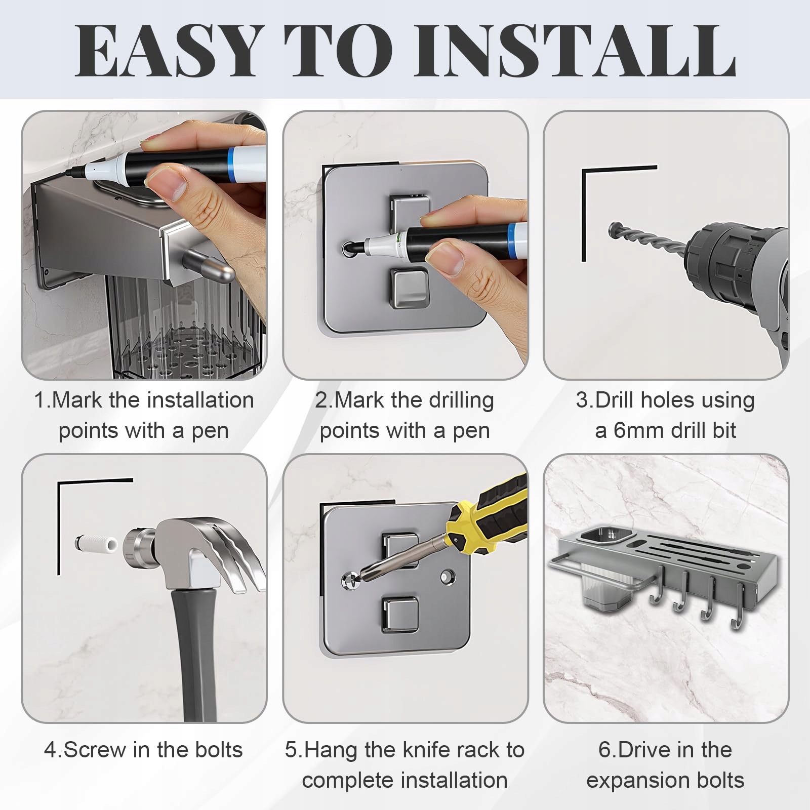 Ważne: Przed instalacją dokładnie przeczytaj instrukcję montażu i postępuj zgodnie z nią krok po kroku. Po instalacji sprawdź, czy uniwersalny blok na noże bez noży jest stabilny i pozostaw go na 24 godziny przed użyciem.