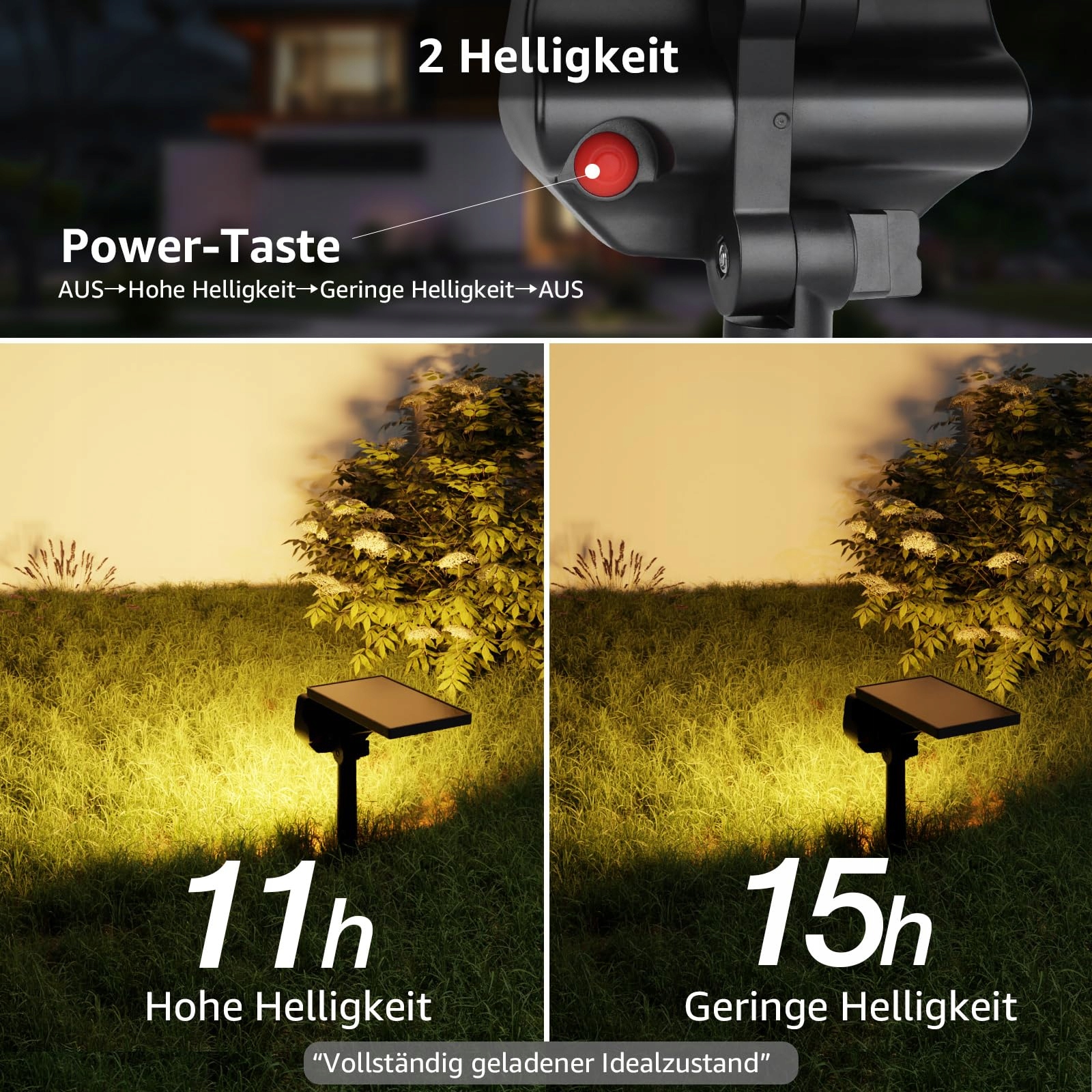 Trwała z dwoma trybami oświetlenia: Ta lampa solarna ma dwa różne tryby oświetlenia: 1.) Mocne światło o jasności 120lm przez około 11 godzin oraz 2.) Słabe światło o jasności 50lm przez około 15 godzin. Zazwyczaj 6-8 godzin ładowania solarnego w ciągu dnia wystarcza na całą noc.