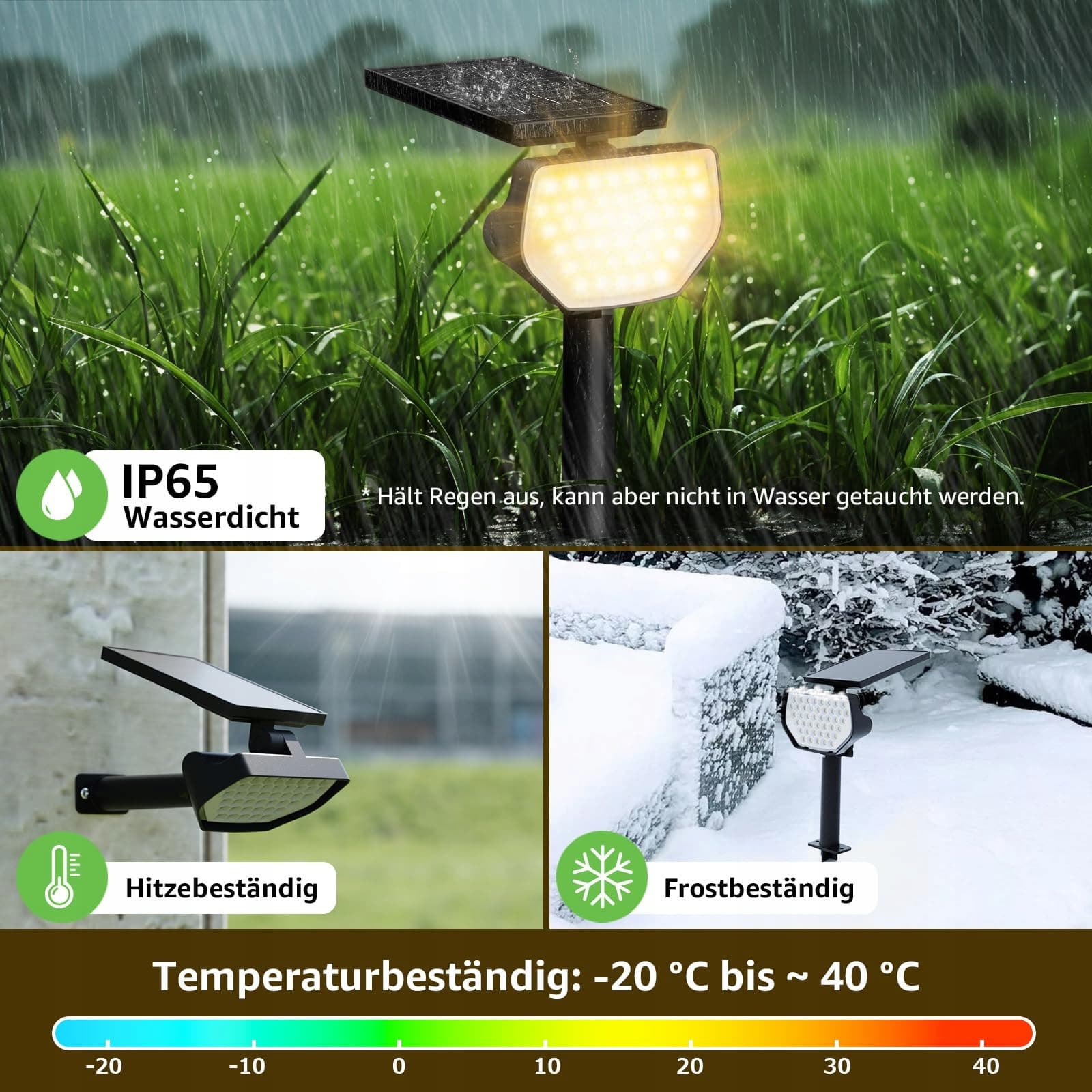 Wodoodporność IP65 i wytrzymałość: Ta solarna lampa do oświetlenia ścieżek wykonana jest z trwałego materiału ABS+PC i jest odporna na promieniowanie UV. Klasa ochrony lampy to IP65. Zakres temperatur pracy wynosi od -20°C do +40°C, niezależnie od deszczu, śniegu, kurzu czy silnego wiatru, nasze światło solarne jest w stanie to wytrzymać.