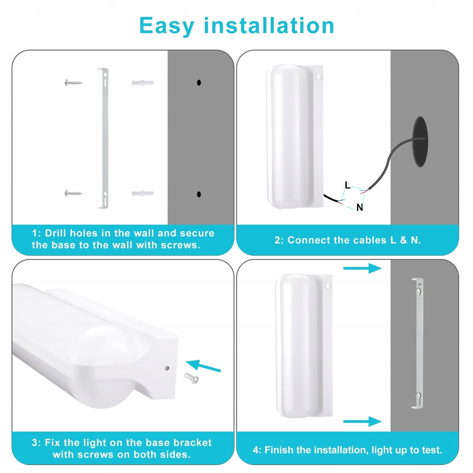 【Wysokiej jakości materiał plastikowy】Ta lampa do pomieszczeń wilgotnych ma zintegrowaną, uszczelnioną konstrukcję i jest wodoodporna IP65. Może być montowana w różnych miejscach, takich jak sypialnia, salon, balkon, piwnica, garaż, ściana zewnętrzna, ogród, klatka schodowa itp. Wskazówka: Okablowanie tej lampy jest bezpośrednio podłączone, jeśli ma być zainstalowana w miejscach narażonych na wilgoć, prosimy upewnić się, że połączenia kablowe są wodoodporne.
