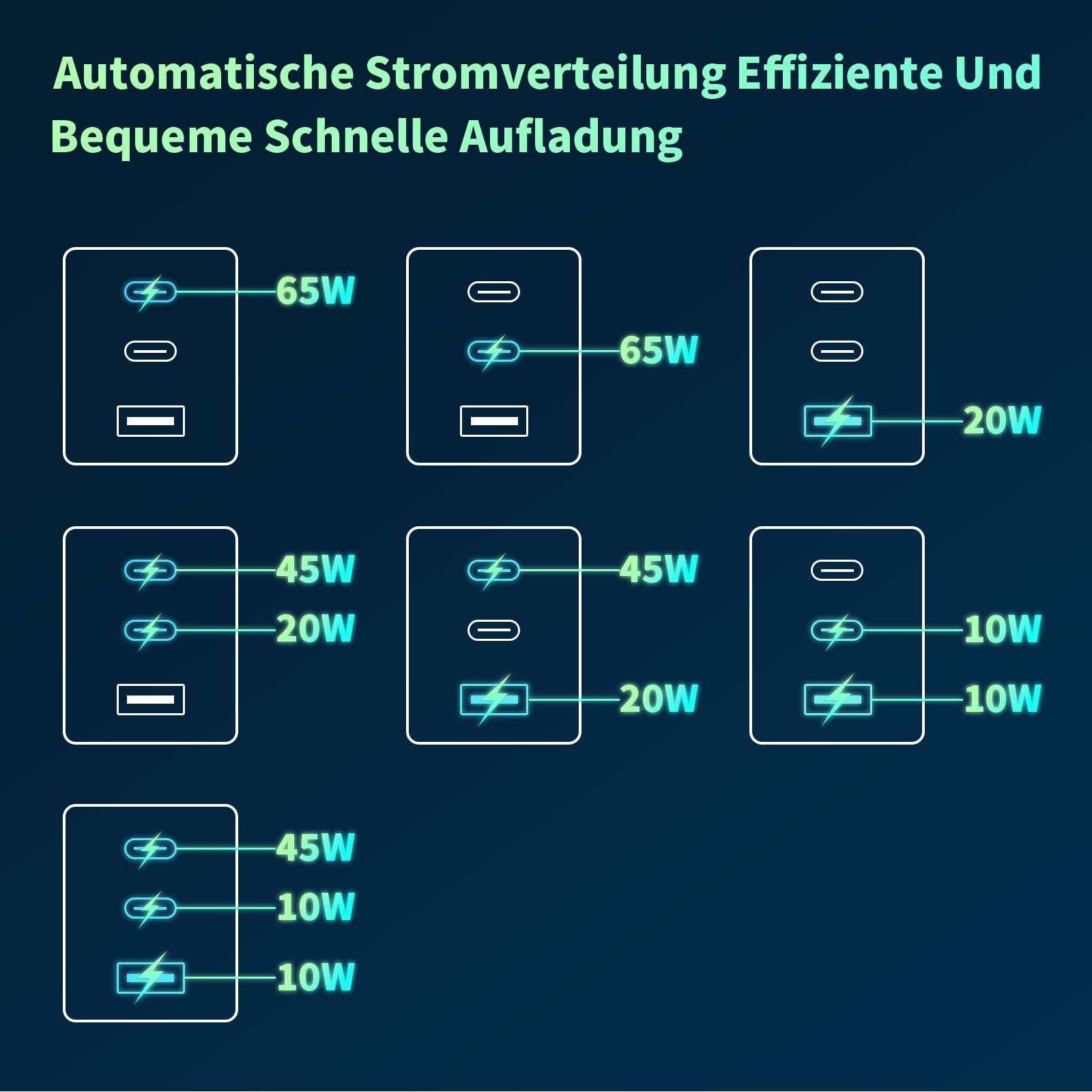 Różne wyjścia mocy: Do używania 1,2,3 portów jednocześnie, wyjścia mocy są różne. Maksymalna prędkość ładowania 65W dla typu c i 20W dla USB działają tylko wtedy, gdy używane jest tylko jedno złącze ładowania. Zobacz nasze zdjęcie 4, aby dowiedzieć się więcej o używaniu jednego, dwóch lub trzech portów jednocześnie