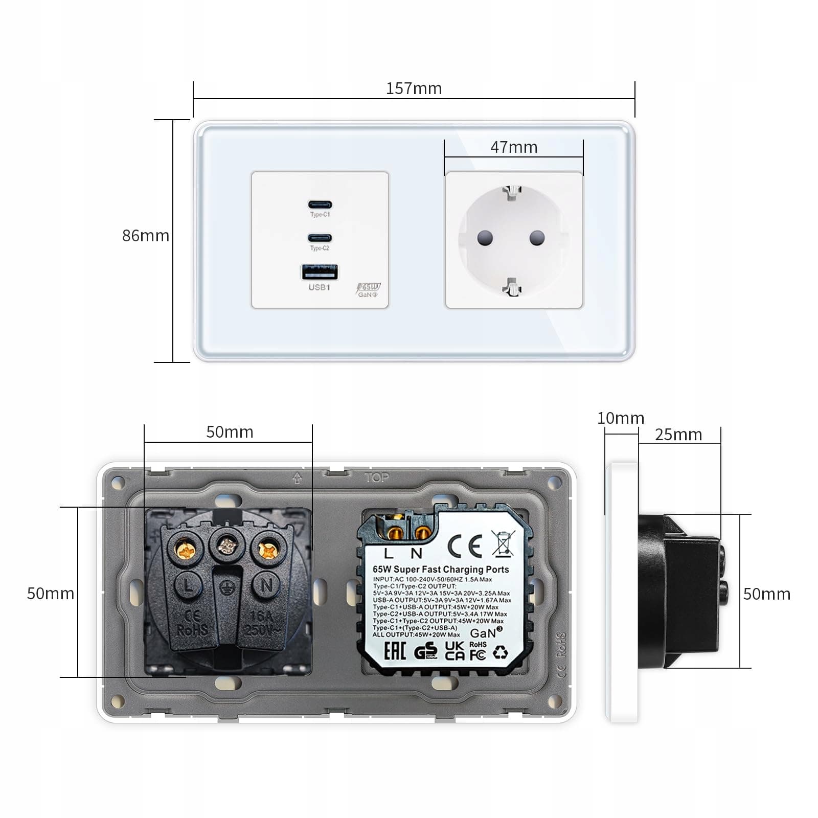 LIAONFOY 2.5D Super Fast Charging Gniazdo ścienne z pojedynczym gniazdem 86mm 100-240V Kompatybilne z iPhone iPad urządzeniem Android Max prędkość ładowania 65W dla typu c 20W dla USB Białe (Neutralne wymagane)