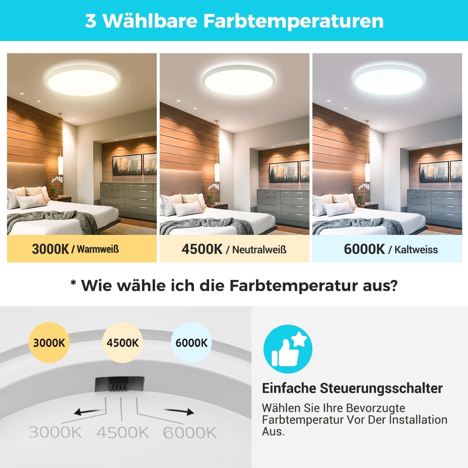 [3-w-1 rozwiązanie kolorystyczne]: Oświetlenie sufitowe Libtit oferuje elastyczne rozwiązanie oświetleniowe w jednej oprawie. Ciepła biel (3000K) zapewnia przytulną atmosferę, neutralna biel (4500K) jest idealna do kuchni i łazienek, podczas gdy zimna biel (6000K) jest doskonała do miejsc pracy i pomieszczeń do nauki. Ciesz się indywidualnym oświetleniem na naciśnięcie przycisku z łatwością