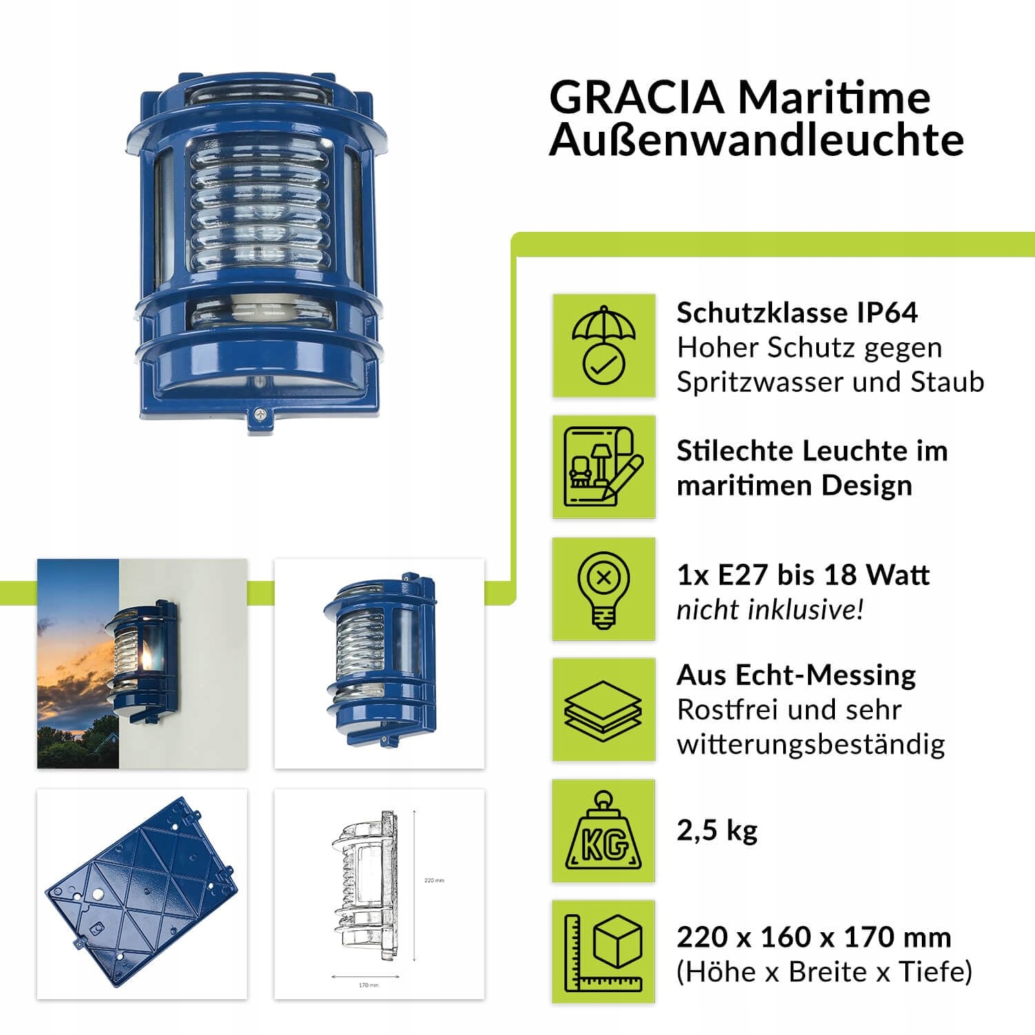 Licht-Erlebnisse Lampa ścienna szklana mosiężna w kolorze niebieskim IP64 taras balkon T:17 cm E27 do 18 W ryflowane szkło marynistyczna nostalgiczna lampa zewnętrzna ogrodowa GRACIA