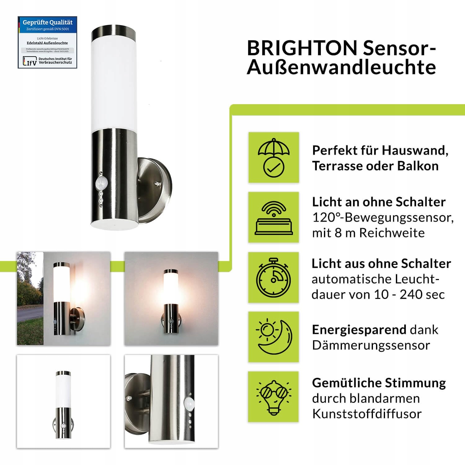 INNE: Sprawdzona jakość certyfikowana przez Niemiecki Instytut Ochrony Konsumentów zgodnie z DVN:5001 | Czujnik: kąt detekcji 120°, zasięg do 8 metrów (w zależności od pogody i miejsca montażu) | Regulacja czułości i czasu świecenia (płynnie regulowane od 10 do 240 sekund) | Specjalna powłoka bezbarwnego lakieru chroniąca przed UV zapobiega żółknięciu. | Dowolny wybór źródła światła: jasność i barwa światła mogą być zmieniane przez samodzielnie wybrane źródła LED