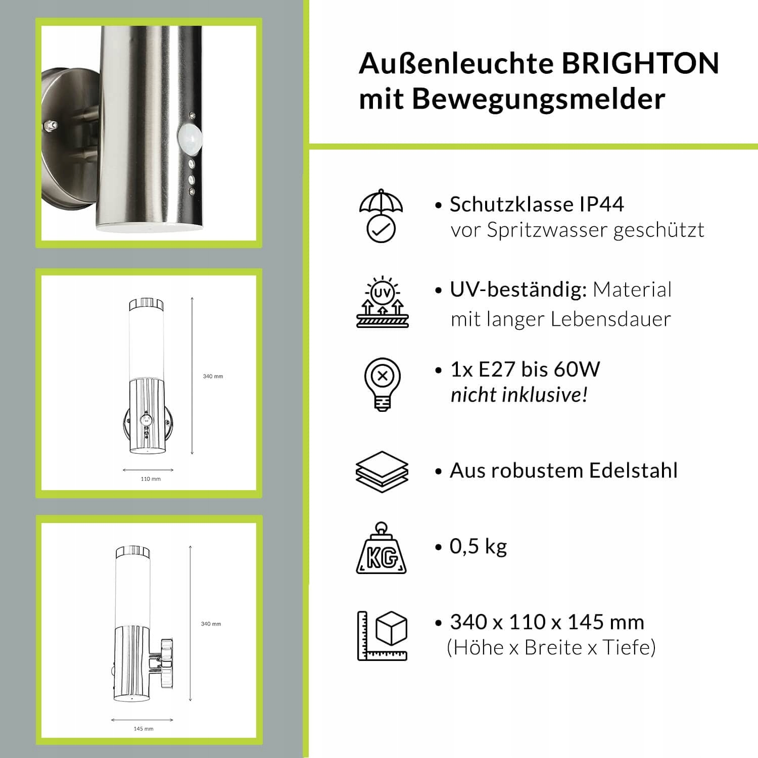 Doświadczenia świetlne Lampa zewnętrzna z czujnikiem ruchu ze stali nierdzewnej w kolorze srebrnym IP44 Ogród Podwórko Wysokość: 34 cm E27 bez olśnienia Nowoczesna lampa ścienna na zewnątrz Taras BRIGHTON