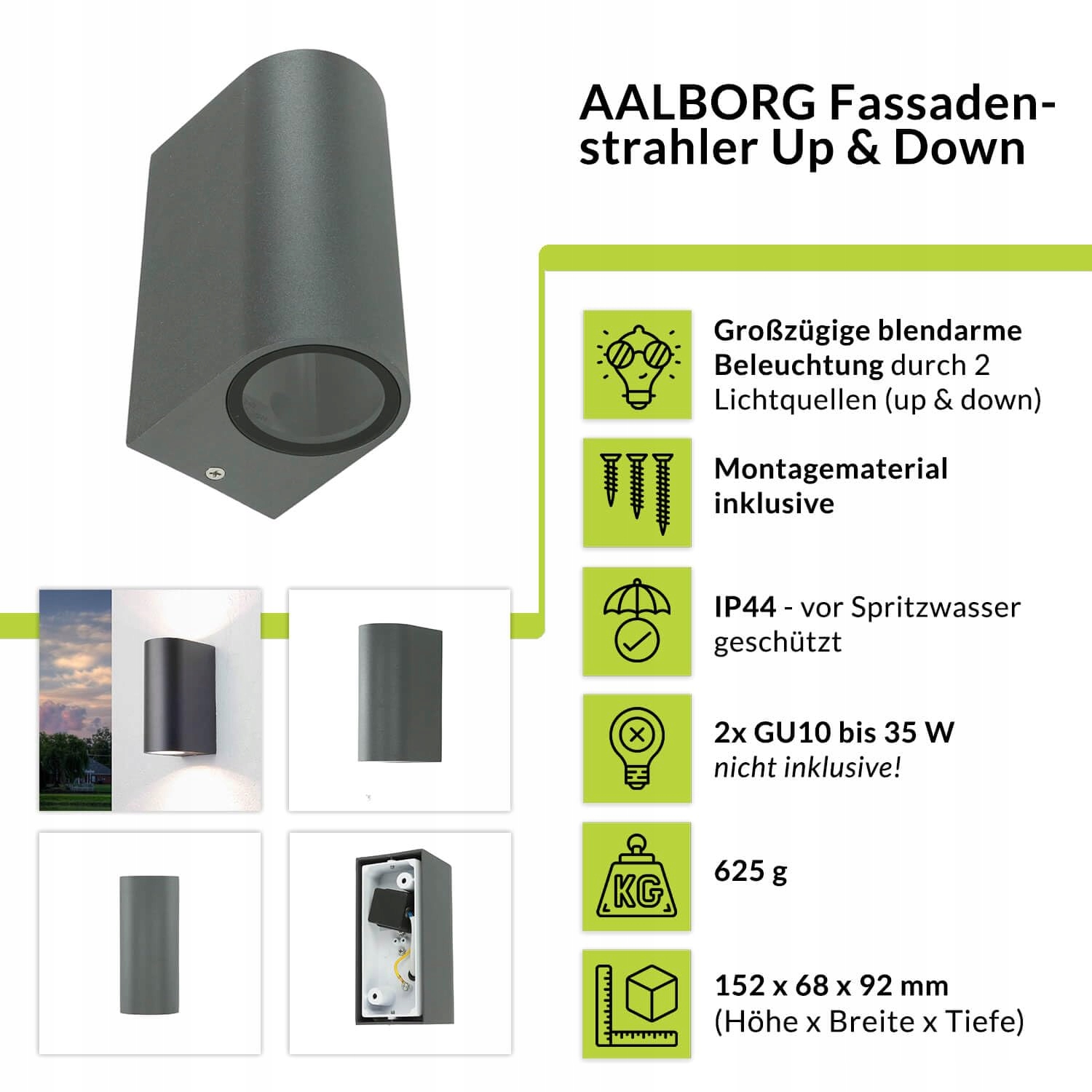 [Wszechstronne zastosowanie]: Niezależnie czy jako stylowa lampa balkonowa, świecące lampy ogrodowe na zewnątrz czy funkcjonalne oświetlenie ścienne – to oświetlenie ścienne zapewnia niezawodne światło tam, gdzie go potrzebujesz | 2 x GU10 do max. 35W (maks. długość: 50 mm) | odpowiednie dla LED | źródła światła nie są w zestawie