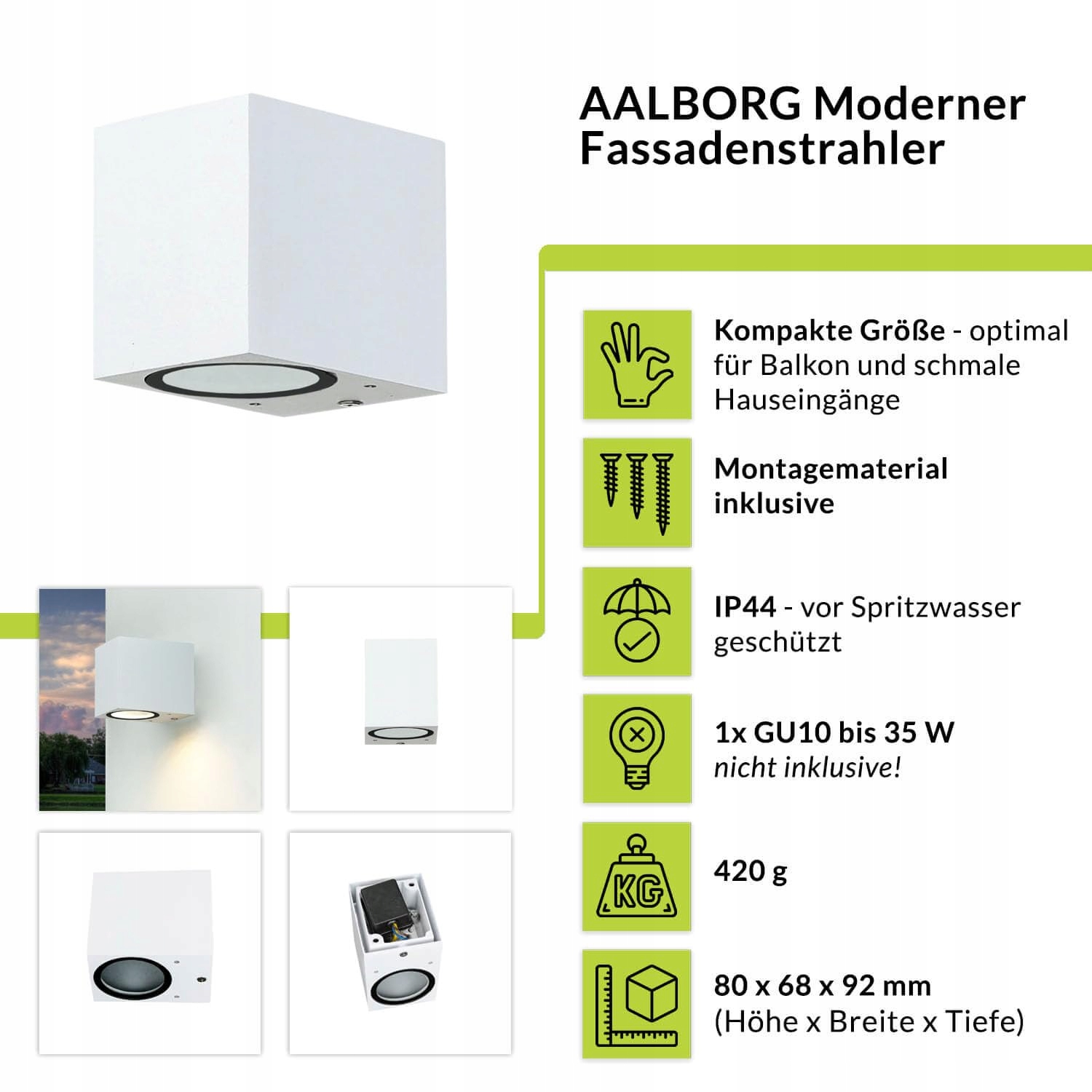 [Trwała i odporna na warunki atmosferyczne]: Zaprojektowana, aby wytrzymać działanie czynników atmosferycznych, ten reflektor ścienny na zewnątrz jest trwałym rozwiązaniem dla oświetlenia zewnętrznego w ogrodzie | 1 x GU10 do max. 35W (max. długość: 50 mm) | odpowiednia dla LED | źródło światła nie jest dołączone | IP44 - wysoka ochrona przed rozpryskami wody