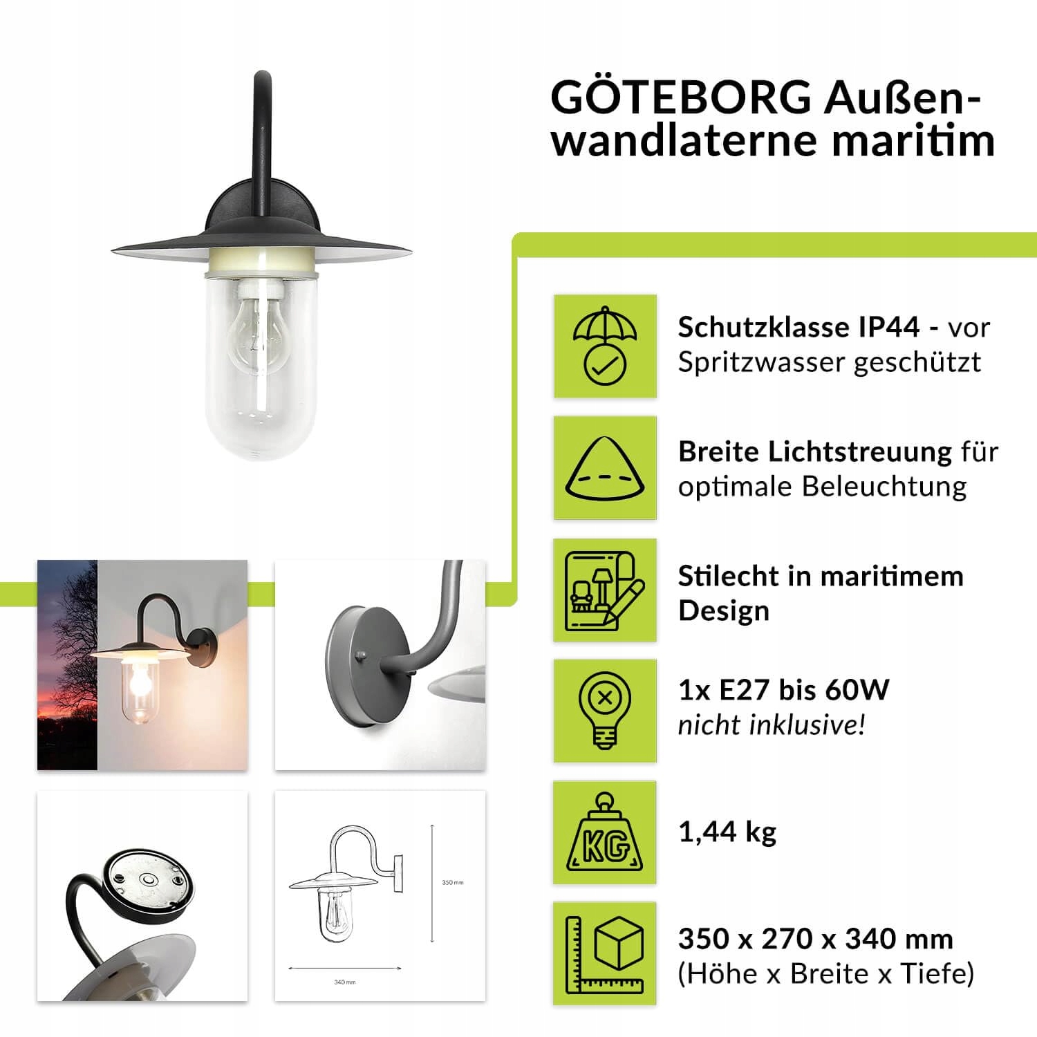 INFORMACJE TECHNICZNE: 1 x E27 do max. 60W | odpowiednia dla LED | źródło światła nie jest w zestawie | IP44 - lampa ścienna zewnętrzna jest chroniona przed wnikaniem wody rozpryskowej ze wszystkich stron oraz większych ciał obcych