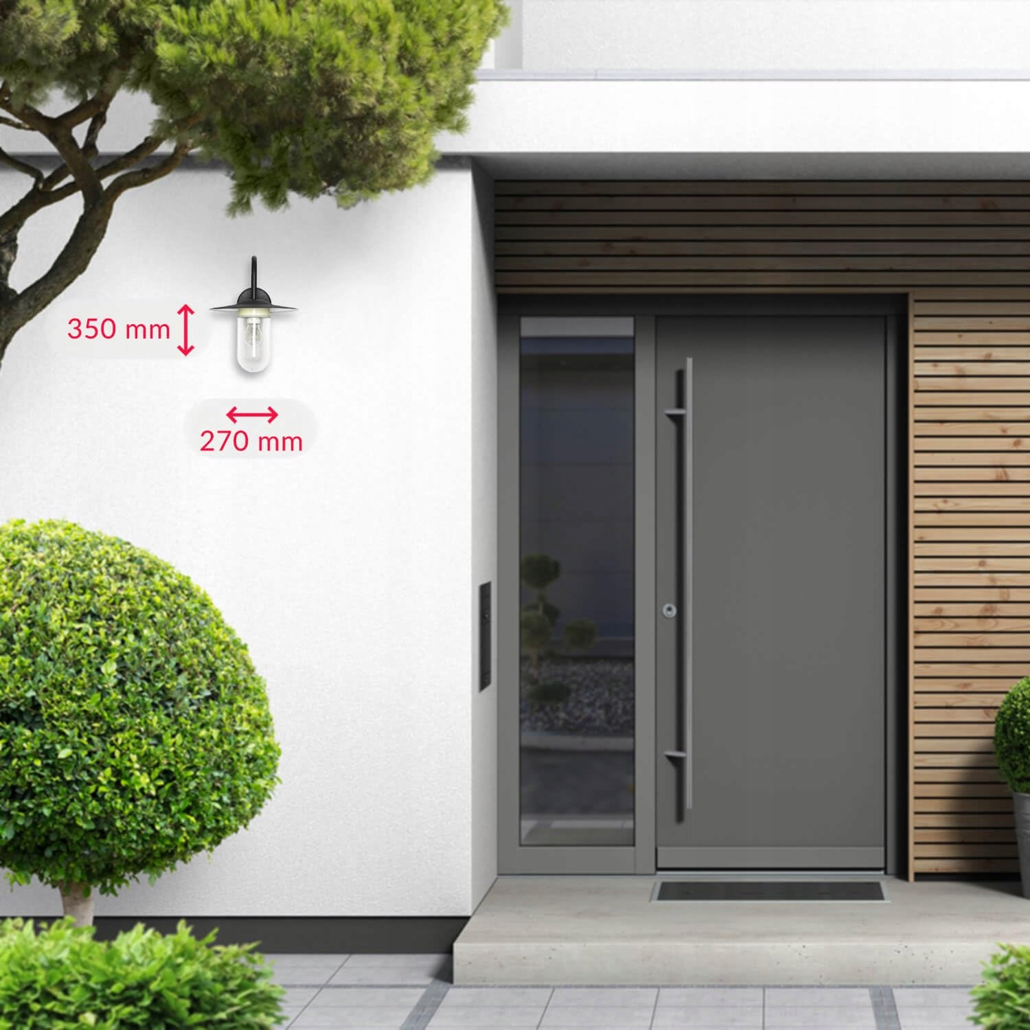 WYMIARY: Wysokość: 350 mm | Szerokość: 270 mm | Głębokość: 340 mm | Średnica klosza: 290 mm | Wysokość szkła: 180 mm | Ø szkła: 110 mm | Odległość między otworami montażowymi: ok. 85 mm