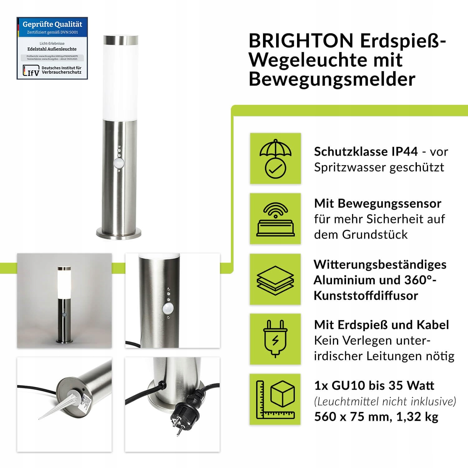 Doświadczenia świetlne Lampa ogrodowa z czujnikiem ruchu ze stali nierdzewnej w kolorze srebrnym IP44 Wejście Ogród 50,5 cm wysokości GU10 Nowoczesna lampa z czujnikiem zewnętrznym BRIGHTON