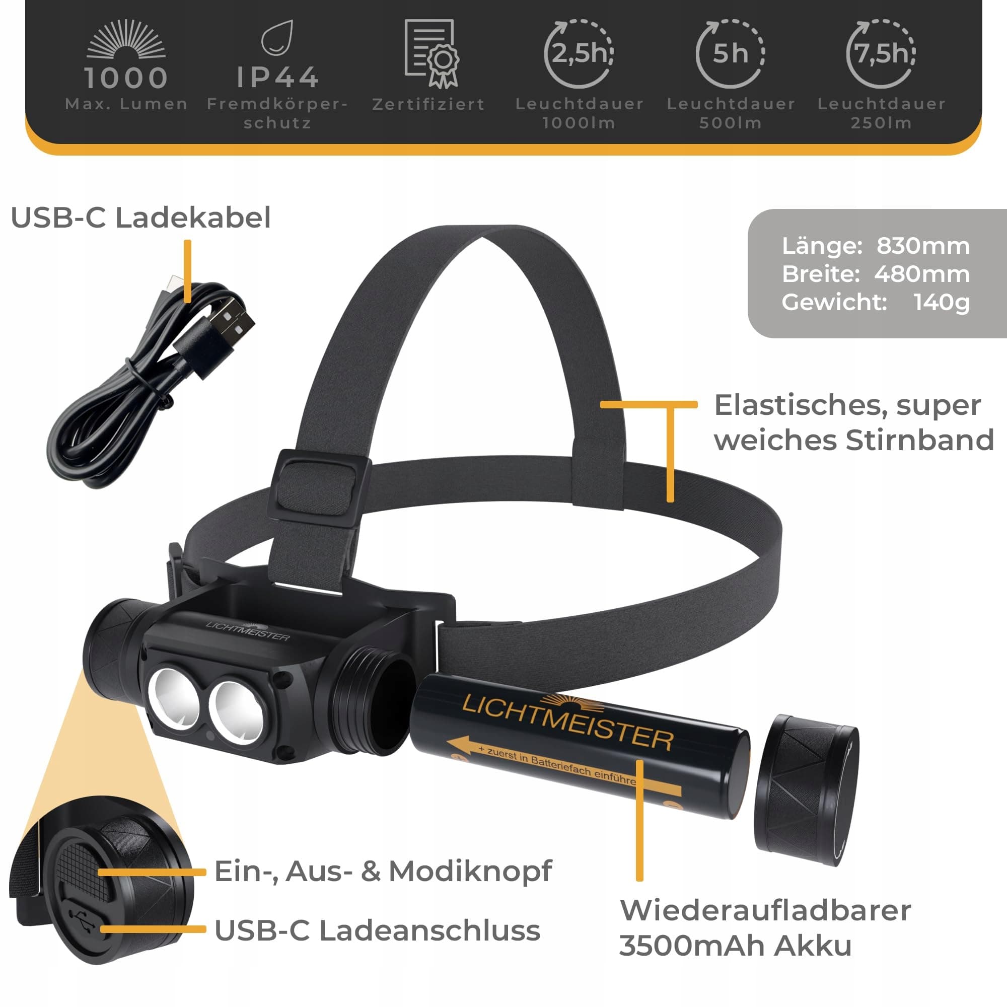 LICHTMEISTER Lampa Czołowa 1000 Lumenów Akumulator 3600 mAh LED | Premium Supply