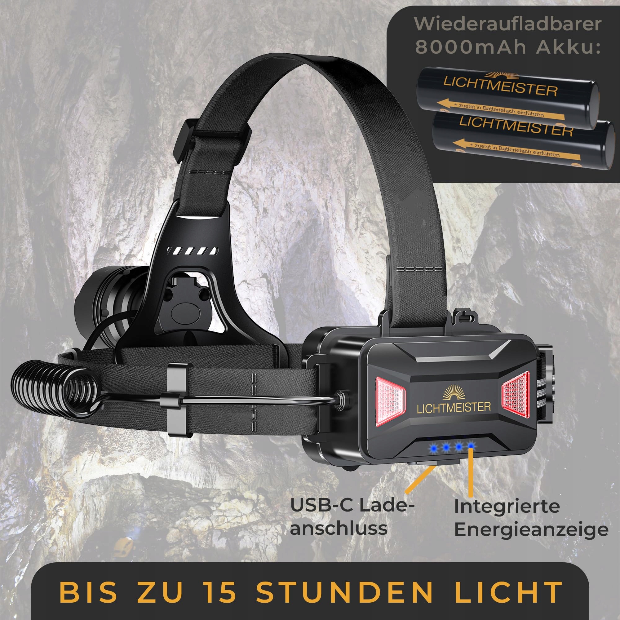 LICHTMEISTER® Latarka czołowa z tylnym światłem (2500 Lumen, 8000 mAh akumulator) - Latarka LED ładowalna - ekstremalnie jasna latarka czołowa - Latarka LED