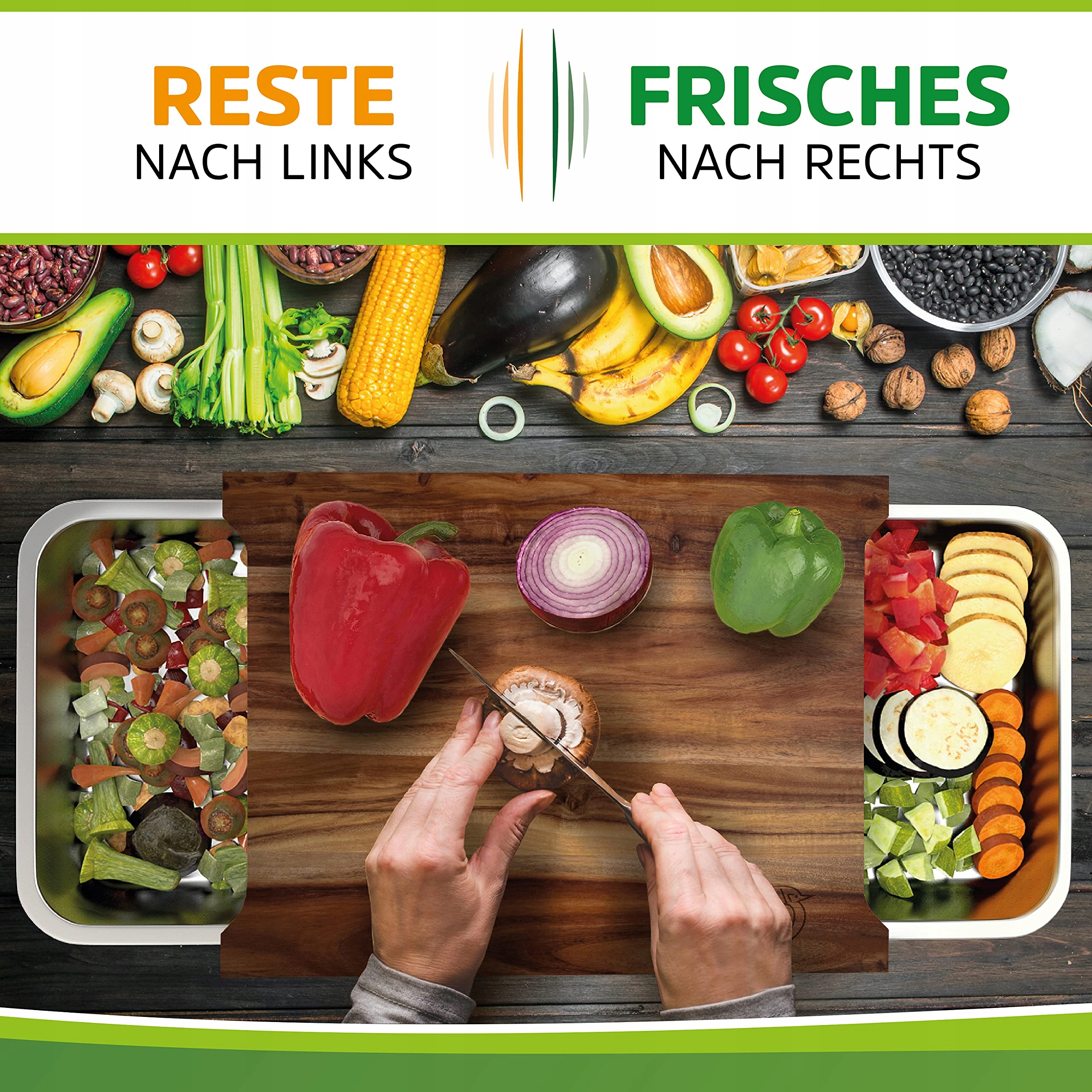 𝗖𝗭𝗬𝗦𝗧𝗔 𝗞𝗨𝗖𝗛𝗡𝗔 - Unikalna deska do krojenia z akacji oferuje szczególnie dużą powierzchnię do krojenia oraz 3 sprytne stalowe miski na pokrojone i odpady. Dzięki temu Twoja kuchnia pozostaje czysta i uporządkowana