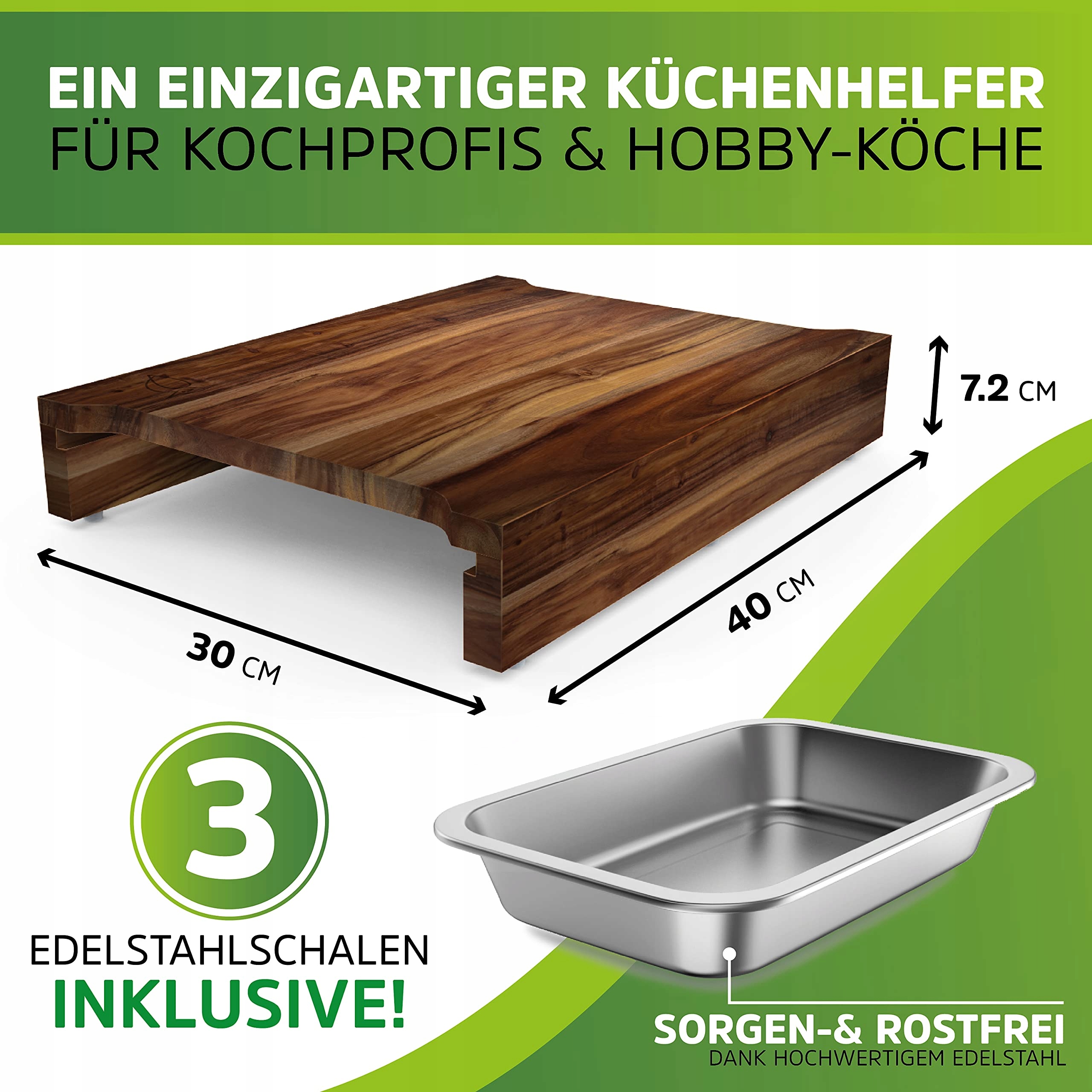 Zestaw desek do krojenia Liebspecht z misami - 40x30x7.2 duży - drewno akacjowe z 3 stalowymi blachami do pieczenia, nadającymi się do mycia w zmywarce - wielofunkcyjna deska kuchenne