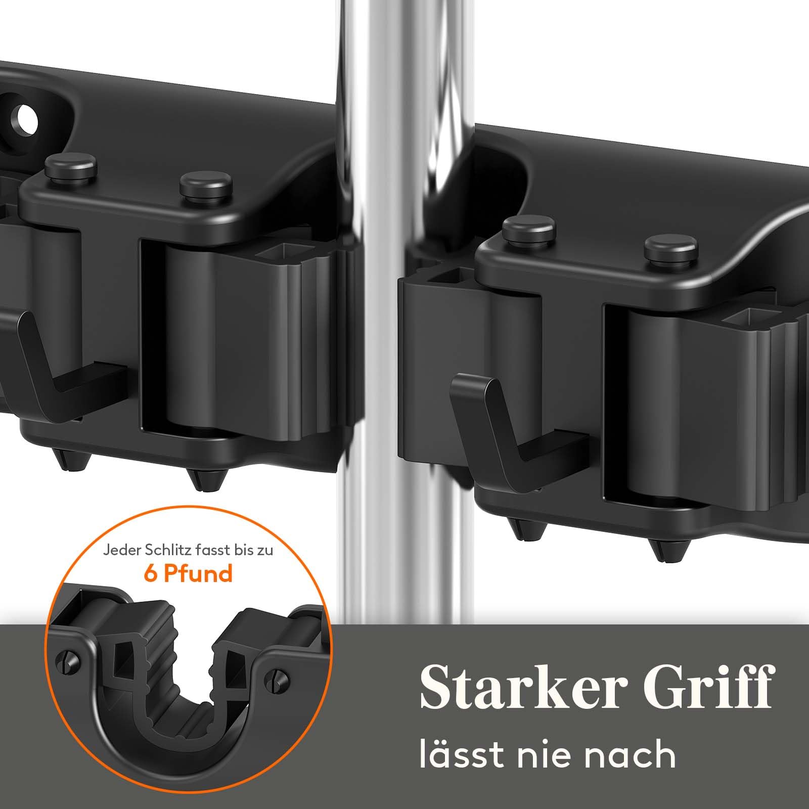 Najsilniejsze trzymanie: Uchwyt na miotły wykonany jest z wysokiej jakości plastiku PP i materiału silikonowego TPE, który posiada stabilny system mocowania, dzięki któremu Twoje narzędzia czyszczące i ogrodowe są bezpiecznie trzymane. Każda szczelina utrzymuje do 3 kg i nadaje się do trzonków o średnicy 19-25 mm.
