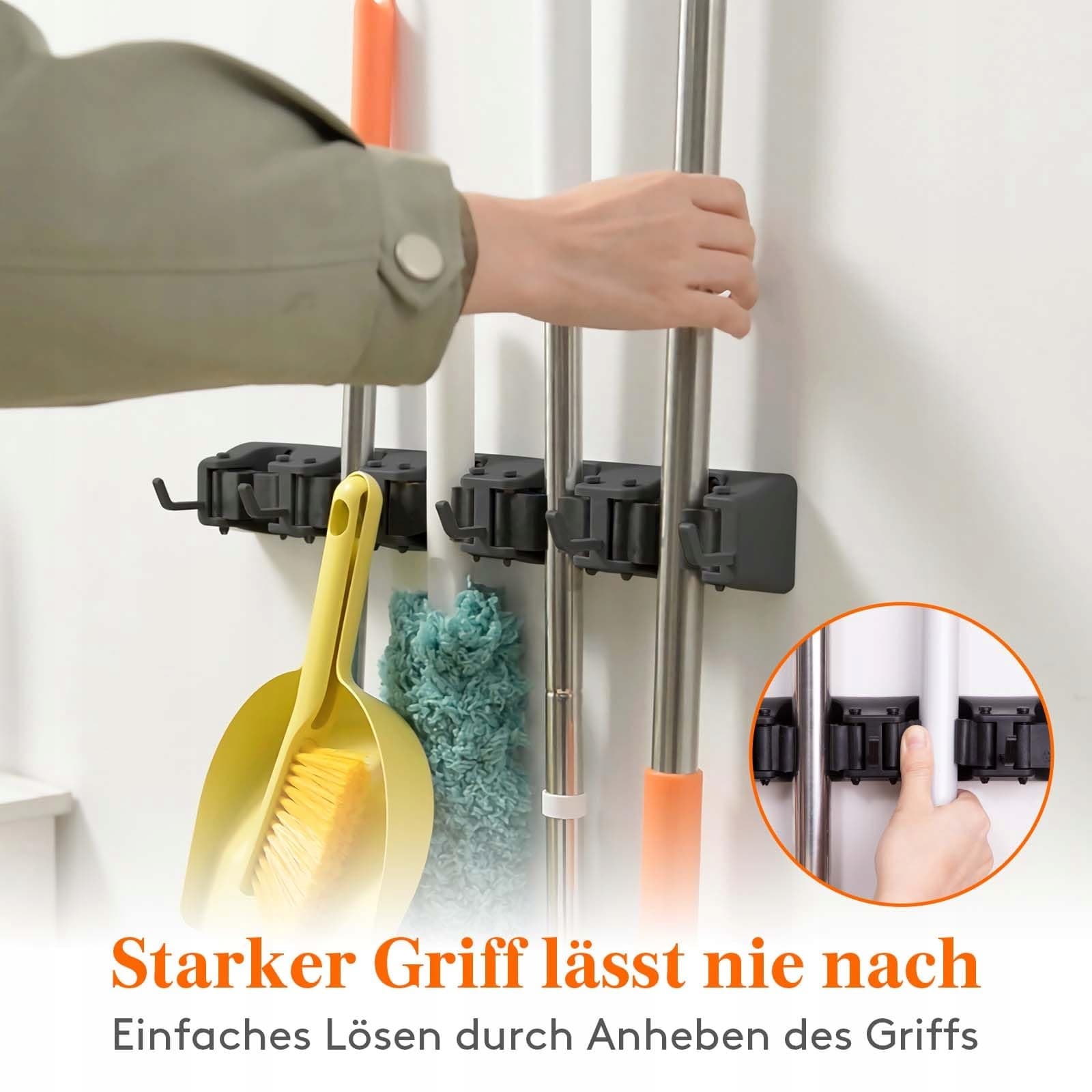 Jednoręczne naciśnięcie: Dzięki unikalnemu, antypoślizgowemu uchwytowi typu Pop-Up, ten uchwyt na miotły jest bardzo praktyczny i szybki w użyciu. Potrzebujesz tylko jednej ręki, aby łatwo wyjąć i odłożyć miotły, mopy, szufelki i inne akcesoria do sprzątania.