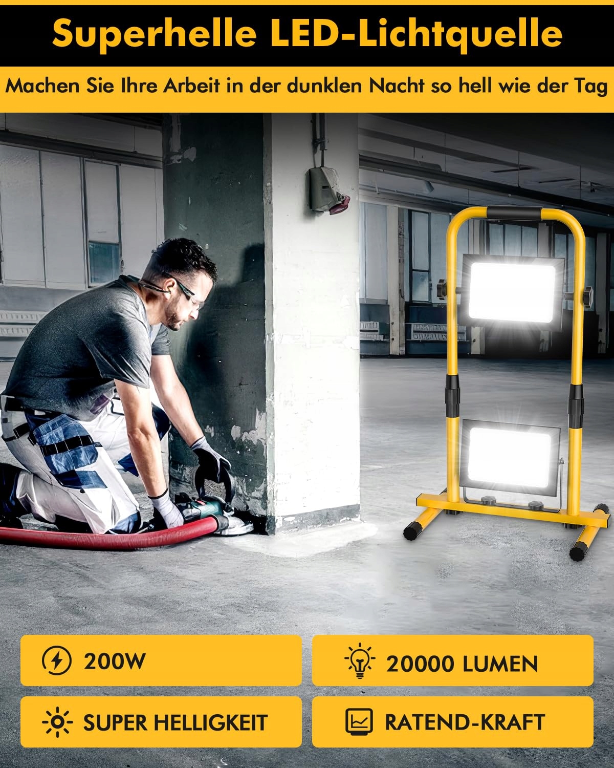Lightasea LED Baustrahler 200W 20000LM LED Arbeitsleuchte 230v z regulowanym stojakiem H, IP66 wodoodporna lampa budowlana LED 6500K zimna biel z kablem 3M i wtyczką do warsztatu, budowy lub garażu