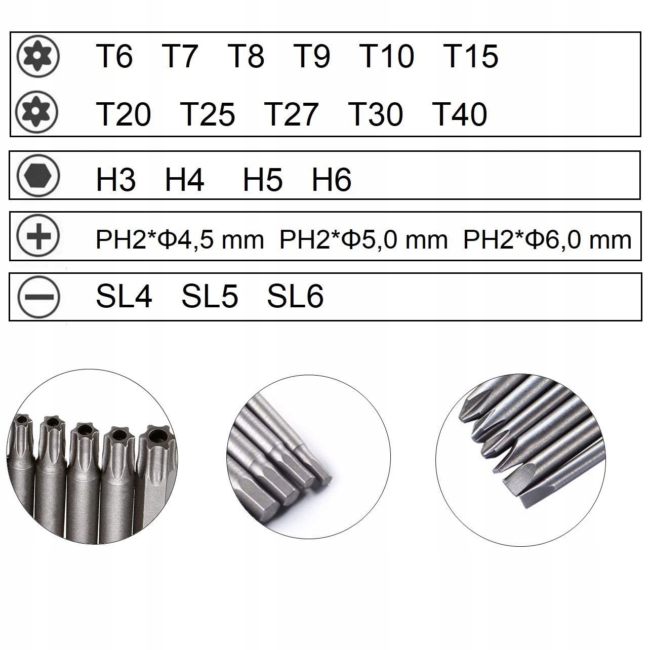 [Różne rodzaje bitów wkrętakowych] Łącznie 21 rodzajów bitów, w tym 11 bitów Torx, 4 bity Hex, 3 bity PH2, 3 bity płaskie, każdy z oznaczeniem laserowym. Możesz je łatwo odróżnić