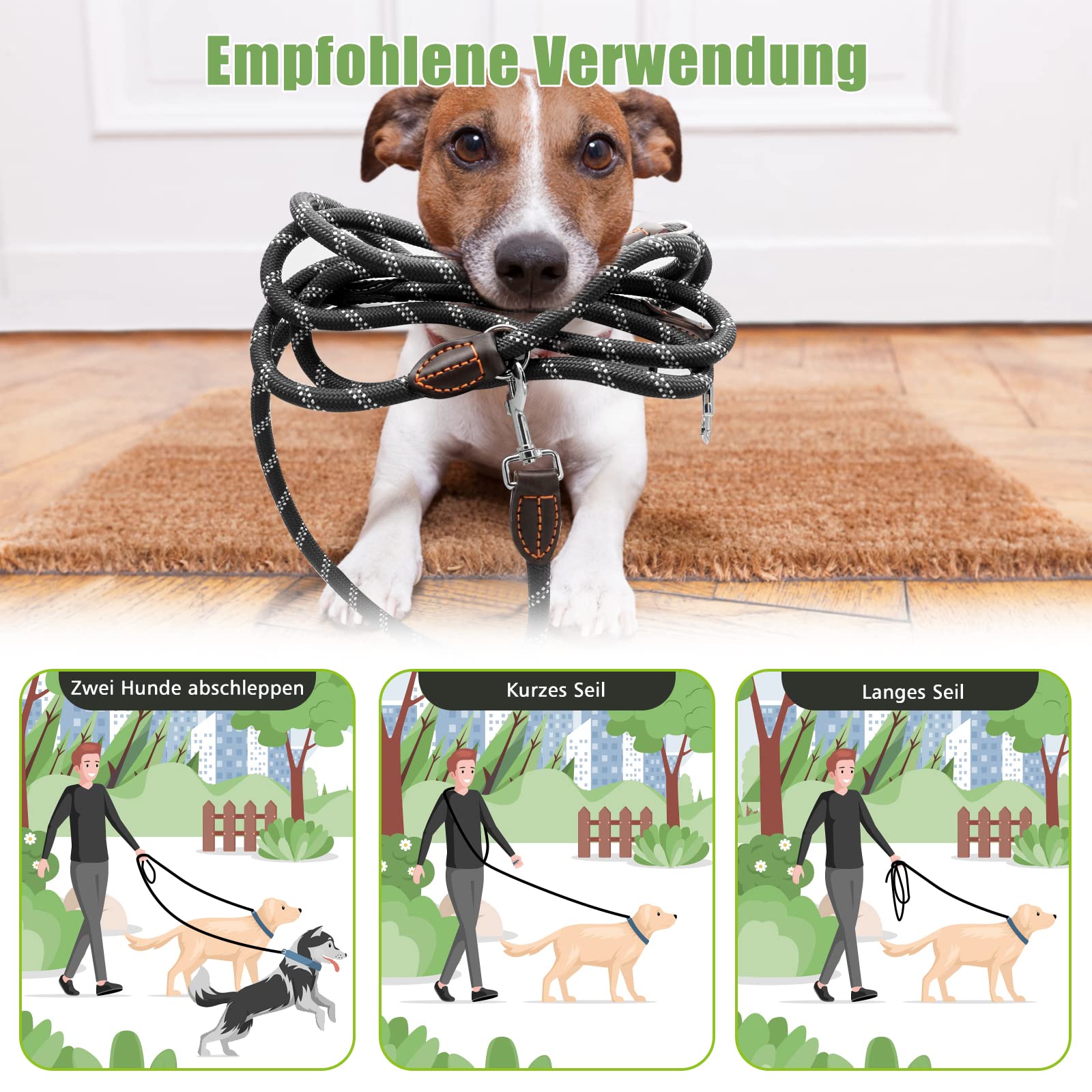 [Regulowana długość]Pasek dla psa ma długość 3 metrów i może być dowolnie regulowany do różnych pozycji w zależności od potrzeb. Można go ustawić na różne długości - 100 cm, 150 cm, 200 cm, 250 cm lub na pełną długość (300 cm). Smycz jako pasek na ramię jest bardziej odpowiednia dla średnich i dużych psów.