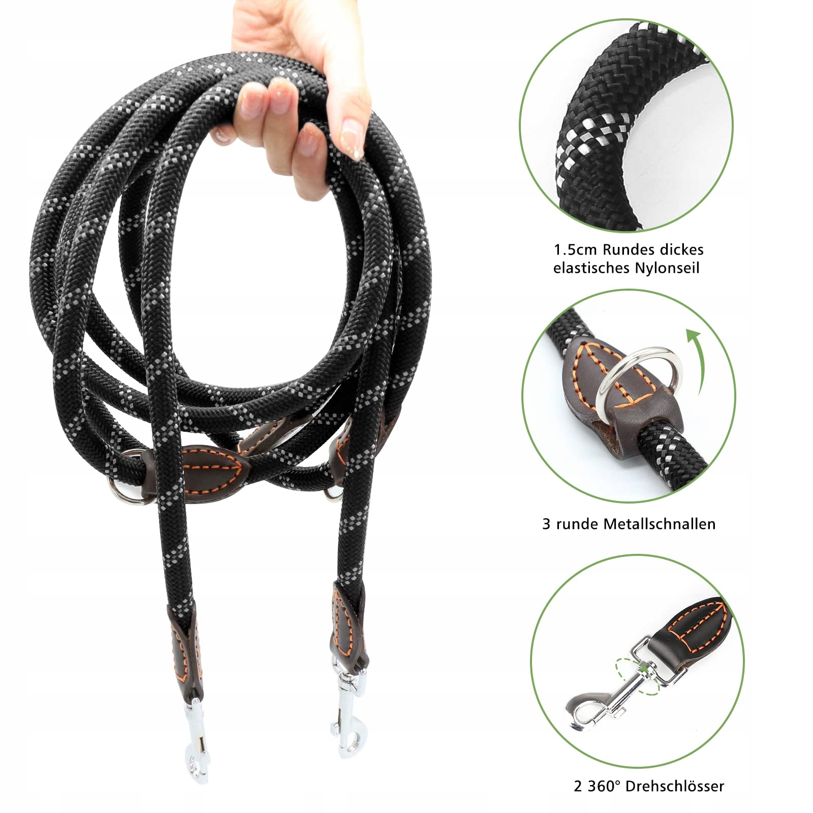 [Regulowana podwójna smycz]Trzymetrowa smycz ma trzy okrągłe pierścienie i dwa stałe haki. Może być używana jako długa smycz dla jednego psa lub jako podwójna smycz dla dwóch psów, poprzez przymocowanie obu końców paska do obroży psów. Pasek doskonale nadaje się również do codziennego treningu, aby prowadzić psa wokół talii.