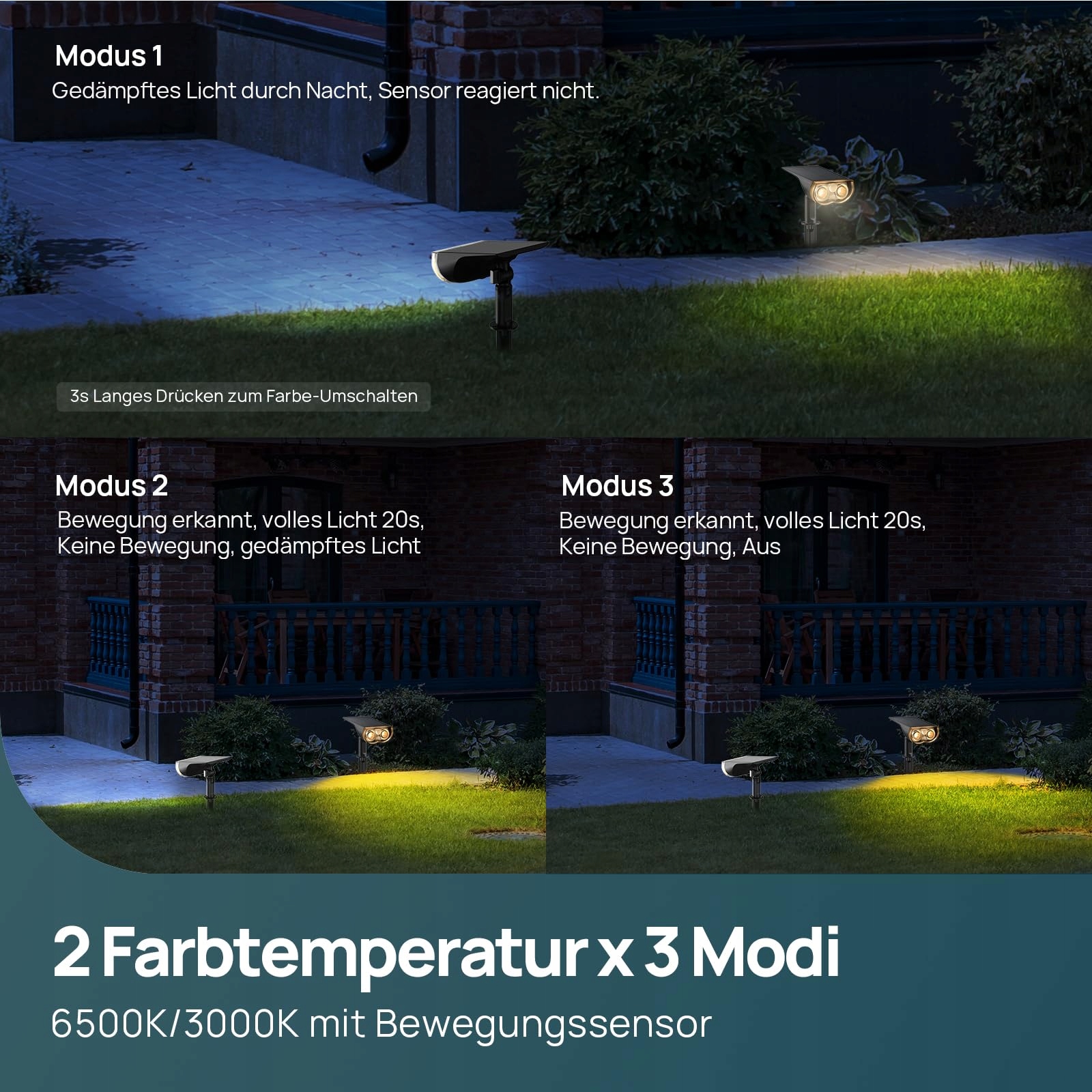 🌼3000K ciepłe światło i klasa ochrony IP65 — Wodoszczelność IP65 pozwala zewnętrznym lampom solarnym wytrzymać wszelkie niekorzystne warunki pogodowe. Ciepłe białe światło nadaje Twojemu ogrodowi przytulną atmosferę. (Kąt obrotu: pionowy 90°/ poziomy 270°).