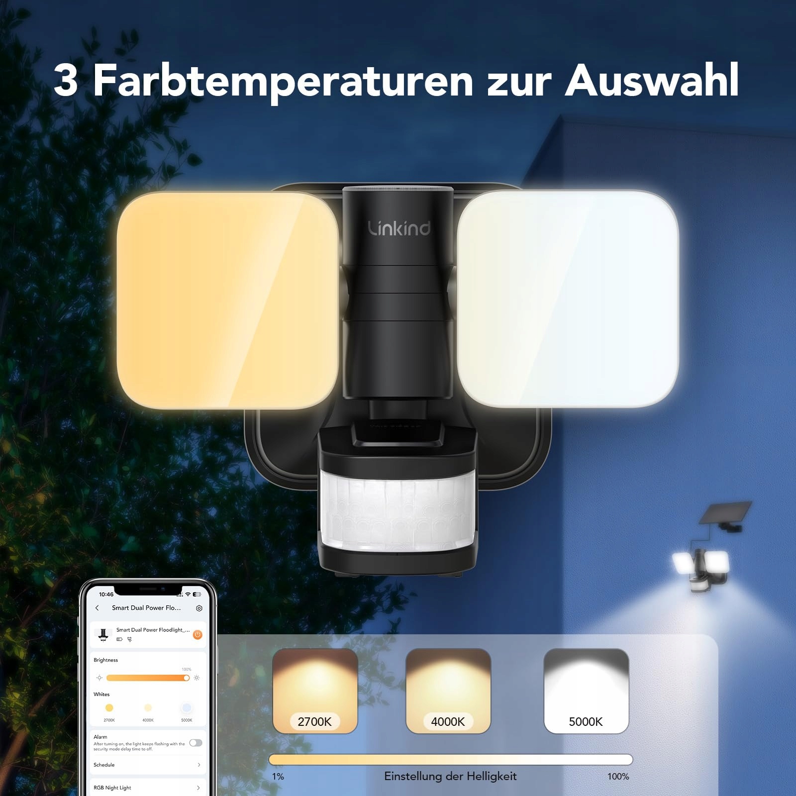 Linkind Smart Hybridowy Reflektor Zewnętrzny z Podwójnym Zasilaniem, 25W/3000LM LED Reflektor z Solar i Elektrycznością, IP65 Lampa Zewnętrzna z Czujnikiem Ruchu, CCT ściemnialna, Timer i RGB Lampka Nocna