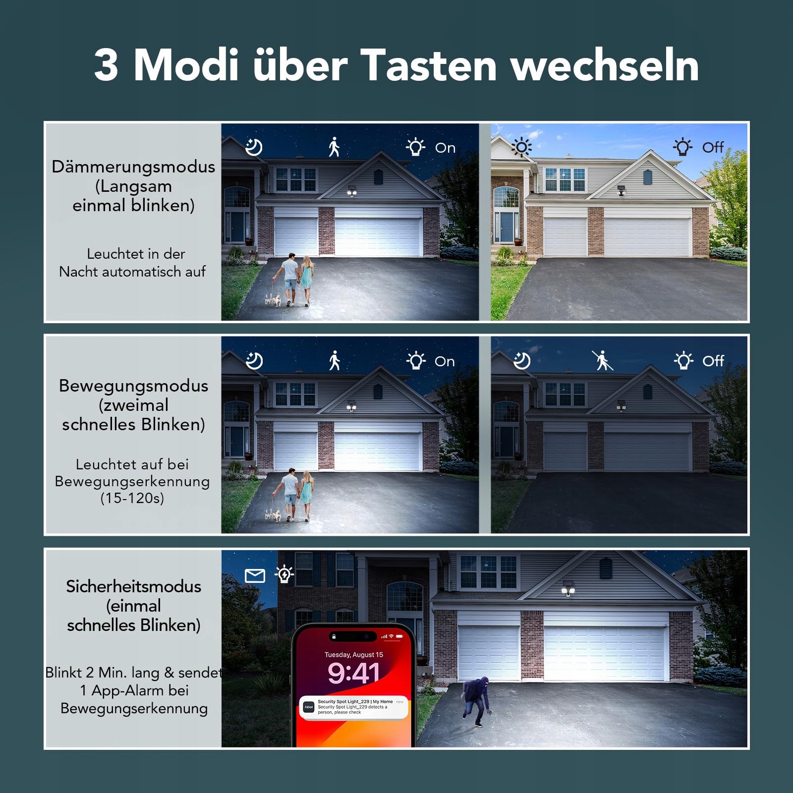 【3 Tryby Pracy & Regulacja 330°】1. Tryb ruchu (przy ruchu świeci przez 15-120s, potem gaśnie) 2. Tryb światła (auto WŁ przy zmroku, auto WYŁ w dzień) 3. Tryb bezpieczeństwa (światło miga przez 2 min przy wykryciu ruchu) Dwa głowice światła można obracać o 200° poziomo i 330° pionowo