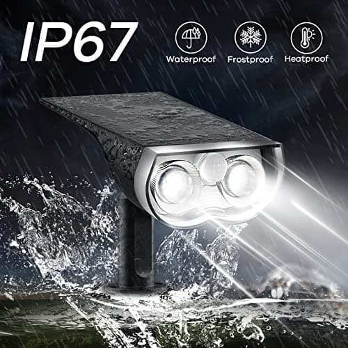 6500K zimne światło i klasa ochrony IP67 — Wodoszczelność IP67 pozwala lampom solarnym na zewnątrz wytrzymać wszelkie niekorzystne warunki pogodowe. Światło dzienne zapewnia bezpieczeństwo w nocy. Kąt obrotu: pionowo 180°/ poziomo 360°
