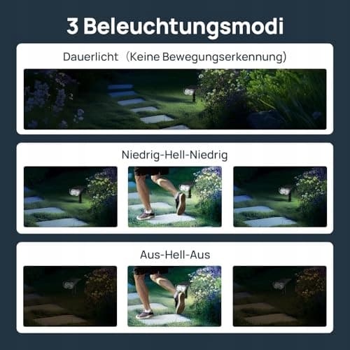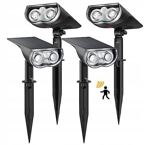 Linkind lampy solarne Reflektor solarny z czujnikiem ruchu 6500K zimna biel, 3 tryby (w tym światło ciągłe), 1000Lm jasne lampy solarne z 2 sposobami montażu, IP67 reflektory ogrodowe na ścieżkę, 4 sztuki