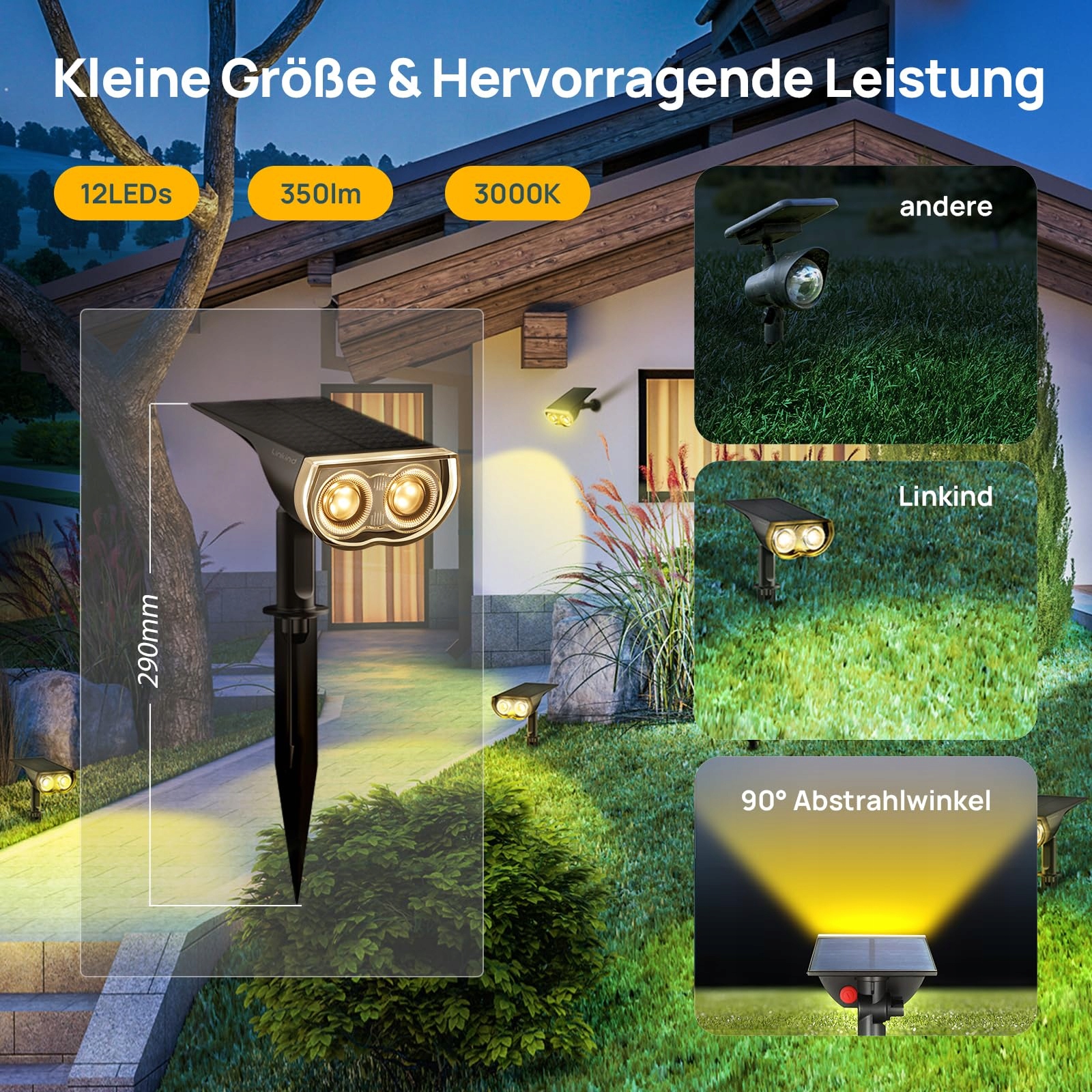 Linkind Solarna lampa ogrodowa na zewnątrz, 3000K ciepła biała LED reflektor solarny 350Lm, automatyczne włączanie/wyłączanie, lampa ścienna solarna do ogrodu IP67 wodoodporna, StarRayS LED reflektor solarny 2 montaż dla roślin, balkon, 4 sztuki
