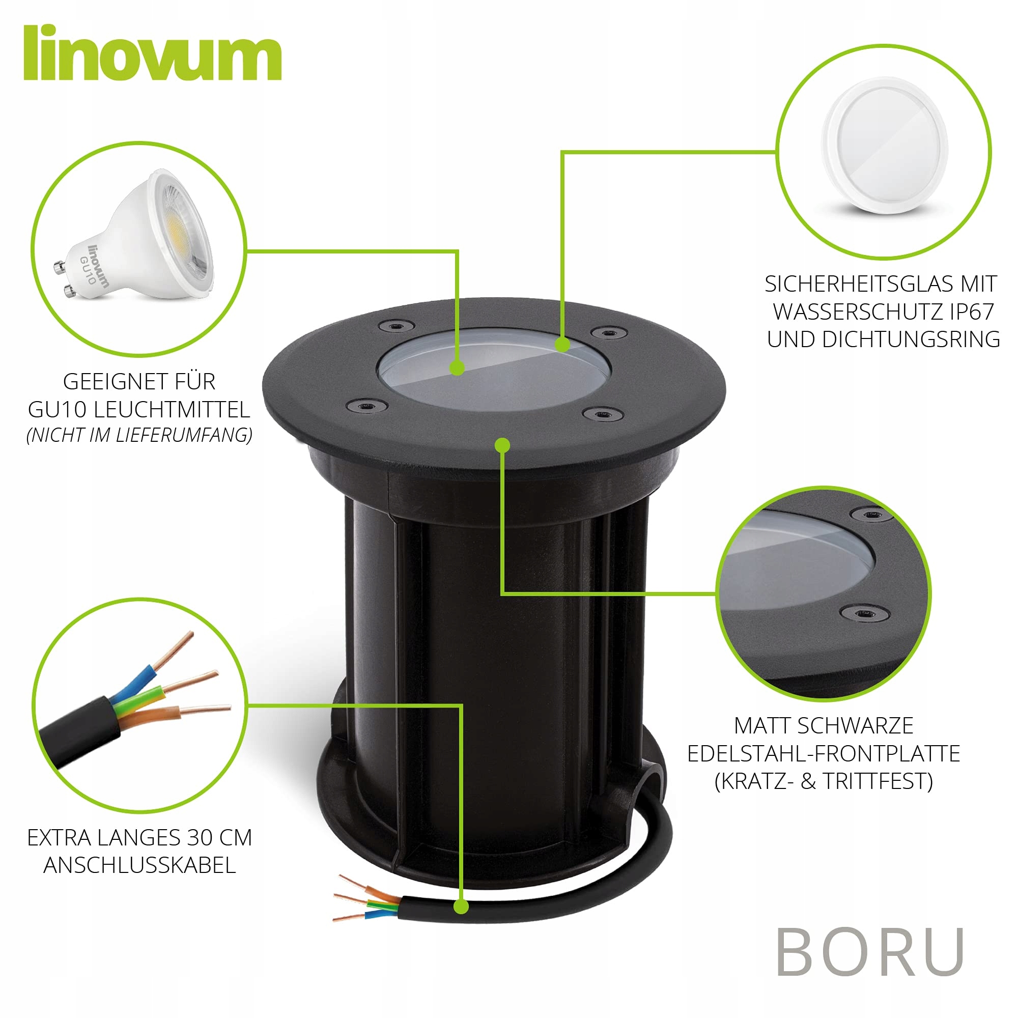 linovum 4-częściowy zestaw BORU wpuszczanych reflektorów podłogowych czarnych z gniazdem GU10 (wymiennym) - okrągłe reflektory podłogowe IP67 odporne na obciążenia i zarysowania