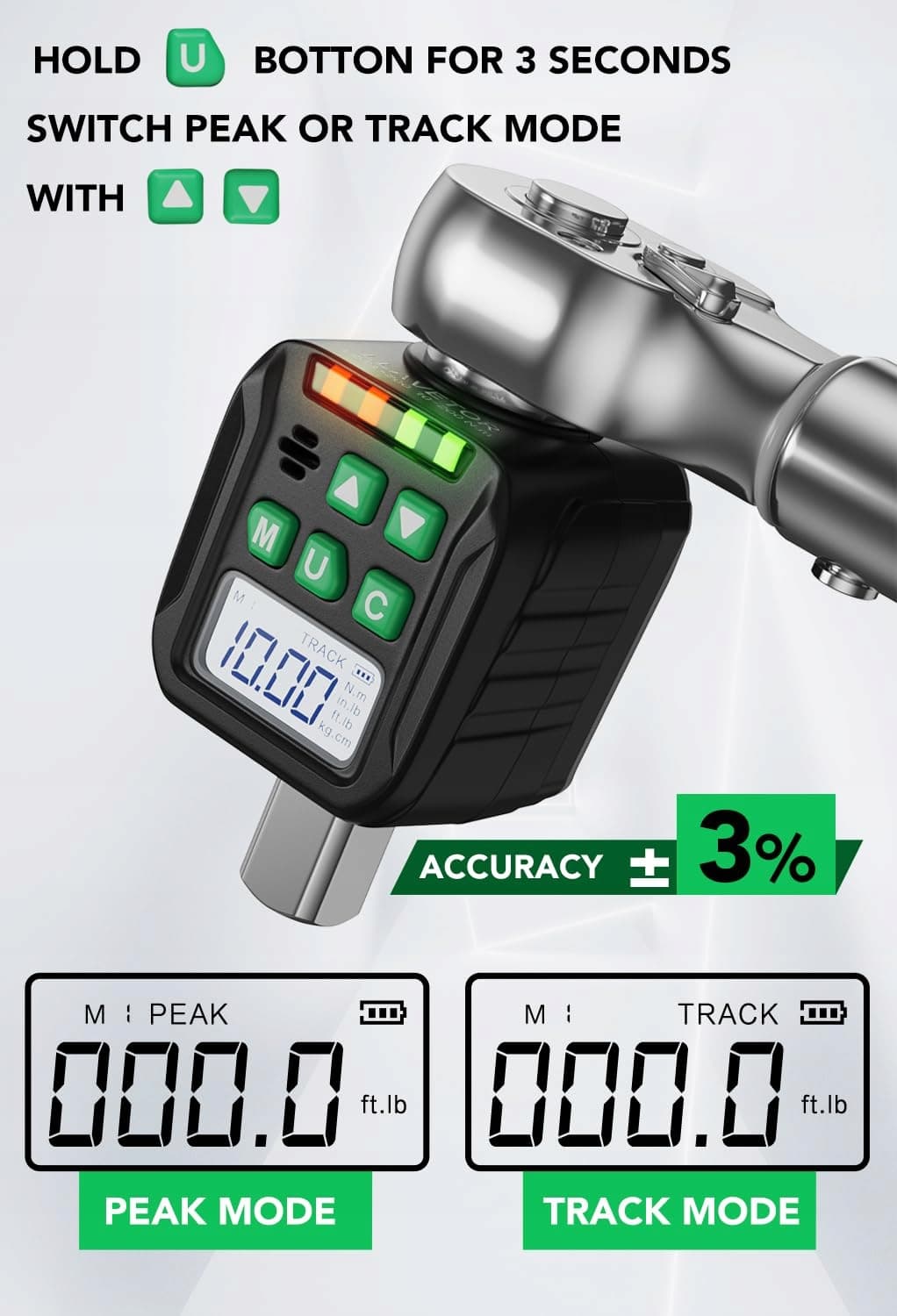 【Tryb TRACK/PEAK】Cyfrowy adapter momentu obrotowego z napędem 1/2 cala ma dwa tryby: tryb TRACK i tryb PEAK. Tryb TRACK wyświetla aktualną wartość momentu w czasie rzeczywistym, a tryb PEAK pokazuje maksymalną wartość momentu, która została osiągnięta podczas pomiaru. W trybie PEAK klucz dynamometryczny może zapisać 500 zestawów danych historycznych, które można w każdej chwili przywołać.