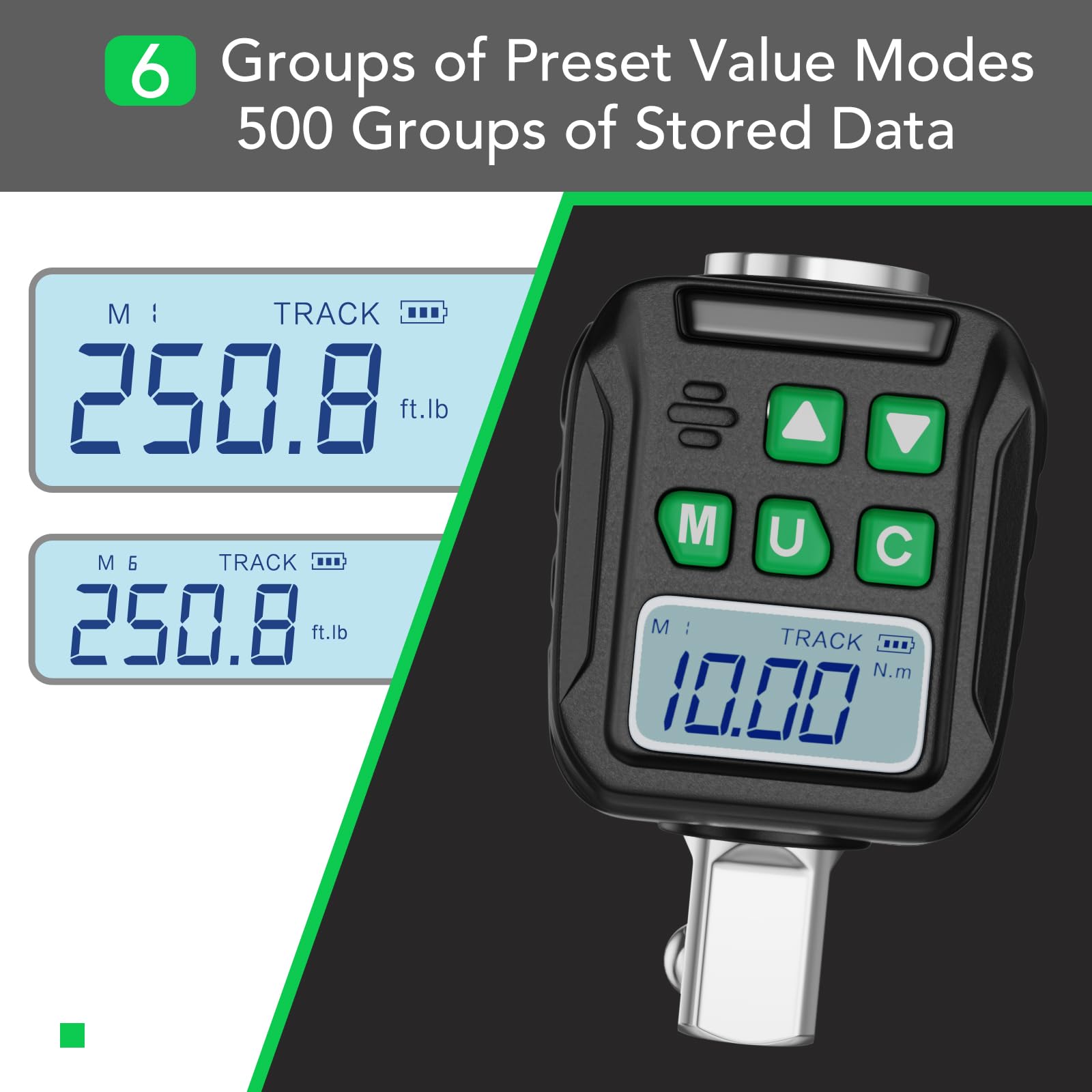 【6 wstępnie ustawionych trybów】Cyfrowy klucz momentowy ma 6 wstępnie ustawionych trybów: M1-M6, dzięki czemu możesz wcześniej ustawić wiele zestawów często używanych wartości momentu. Umożliwia to szybkie i wygodne przełączanie podczas użytkowania. Wyświetlacz LCD z podświetleniem jest wyraźny i łatwy do odczytania, nawet w ciemnych warunkach.