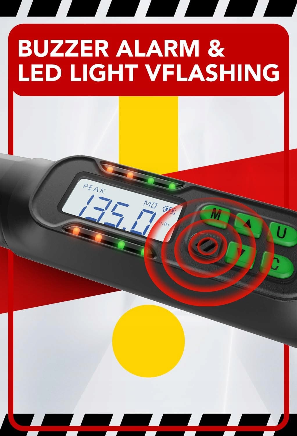 Posiada sygnalizator dźwiękowy i wyświetlacz LED, aby ostrzec Cię, gdy zastosowana siła osiągnie wstępnie ustawioną wartość.