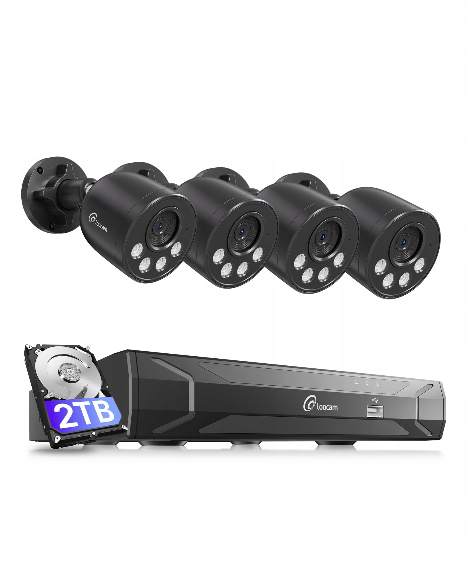 Loocam 4K 8MP PoE Zestaw kamer do monitoringu zewnętrznego - 8-kanałowy NVR H.265+ z dyskiem 2TB HDD i 4x zewnętrzne kamery wideo, wykrywanie osób/pojazdów, widzenie nocne do 30m, zdalny dostęp, nagrywanie 24/7