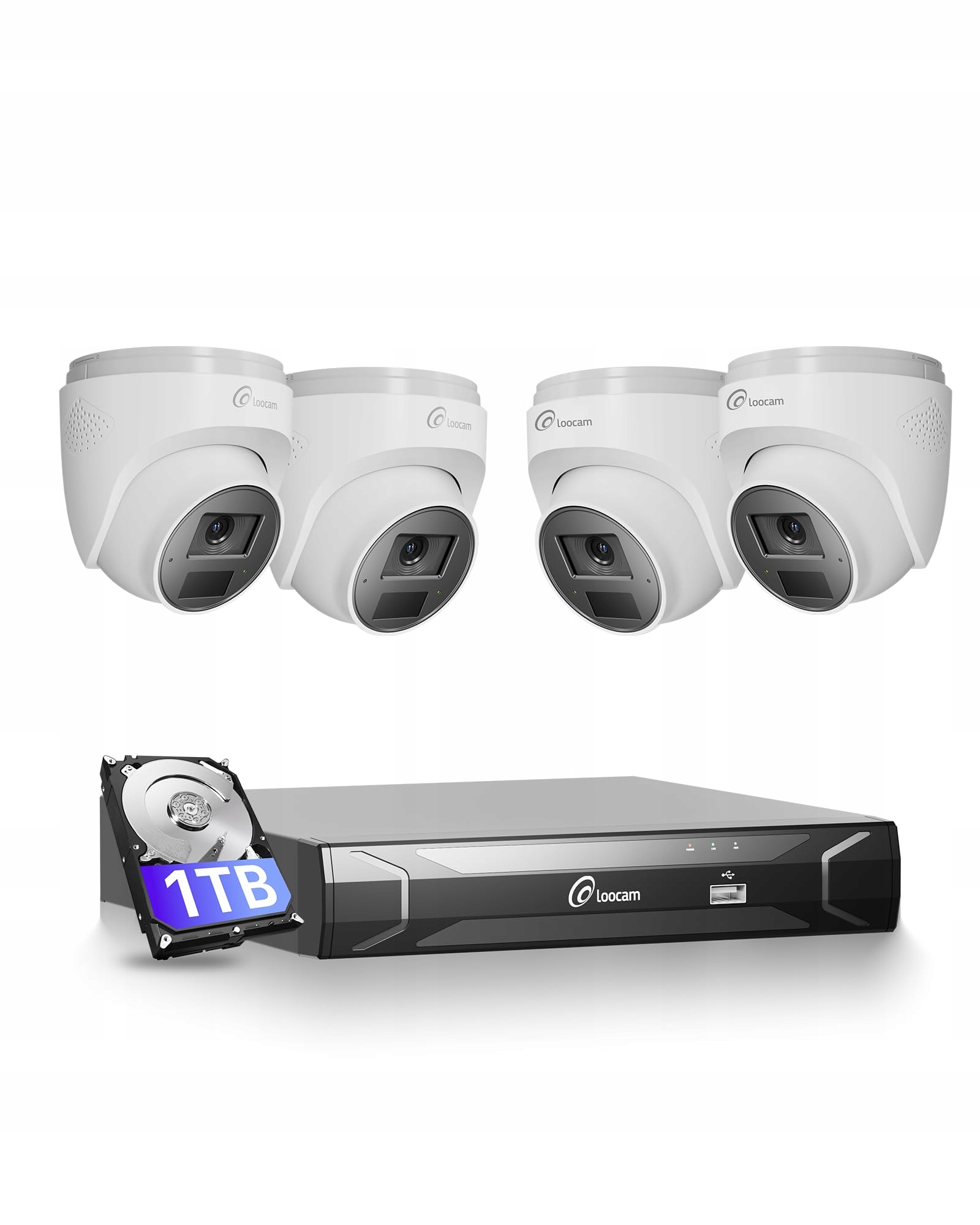 Loocam PoE zestaw kamer monitoringu zewnętrznego, 8-kanałowy system NVR z 4x 4MP kamerami POE-IP, 1TB-HDD do nagrywania 24/7, 30m IR widzenie nocne, wykrywanie osób/pojazdów, dwukierunkowe audio