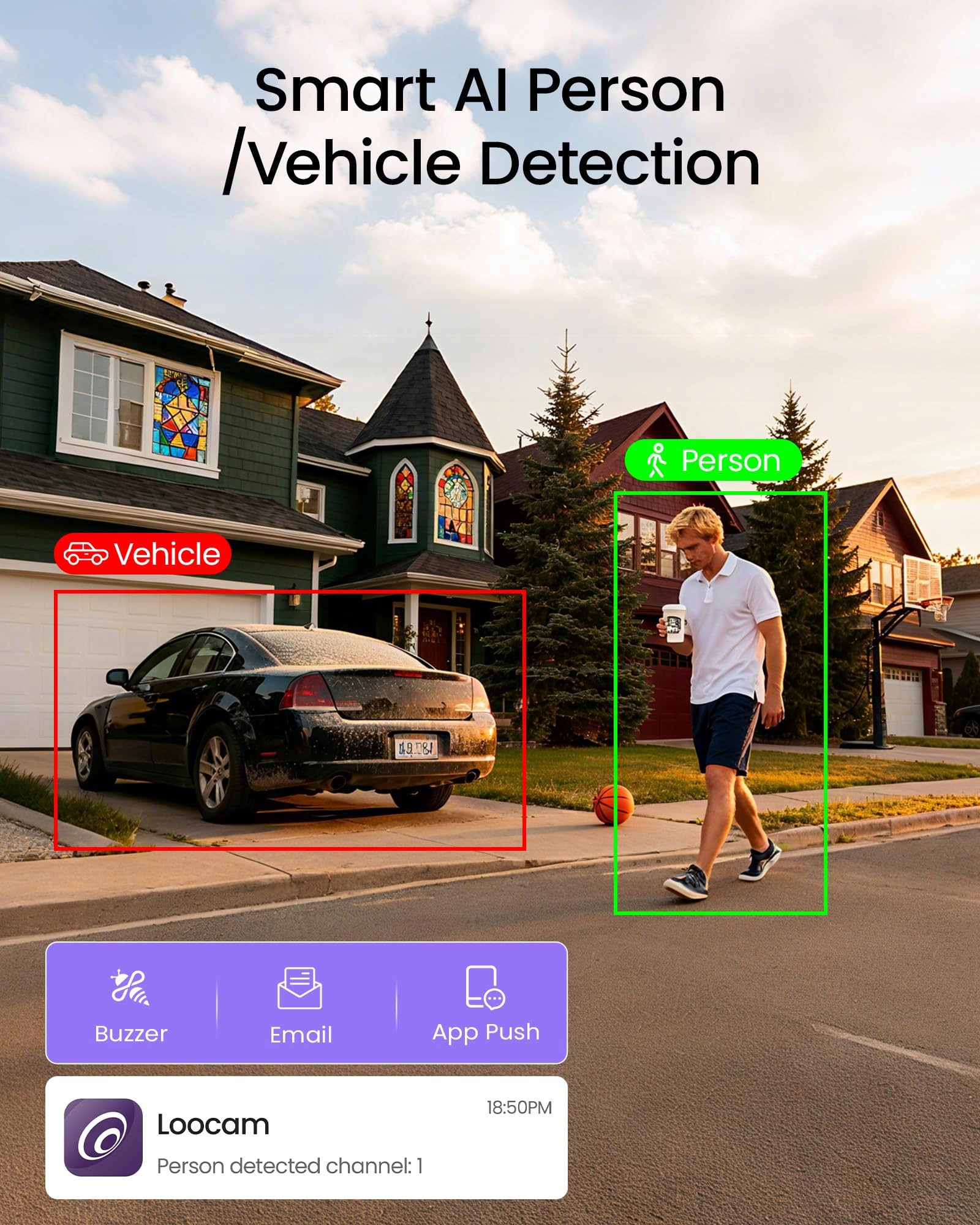 [𝗜𝗻𝘁𝗲𝗹𝗶𝗴𝗲𝗻𝘁𝗻𝗮 𝗦𝗶𝗲ć 𝗦𝗶𝗴𝗻𝗮𝗹𝗶𝘇𝗮𝗰𝗷𝗶 & 𝗡𝗮𝘁𝗰𝘇𝗮𝘀𝗼𝘄𝗲 𝗔𝗹𝗮𝗿𝗺𝘆] Znacznie zmniejsz liczbę fałszywych alarmów dzięki inteligentnej AI zestawu PoE, która skutecznie rozpoznaje twarze, osoby i pojazdy – dzięki temu fałszywe alarmy wywołane przez zwierzęta domowe, wiatr lub liście są unikane. Przy wykryciu ruchu przewodowy system monitoringu natychmiast uruchamia syrenę, reflektory oraz powiadomienia e-mail i push w aplikacji w czasie rzeczywistym, dzięki czemu możesz szybko reagować na potencjalne zagrożenia bezpieczeństwa i chronić swój majątek przez całą dobę.