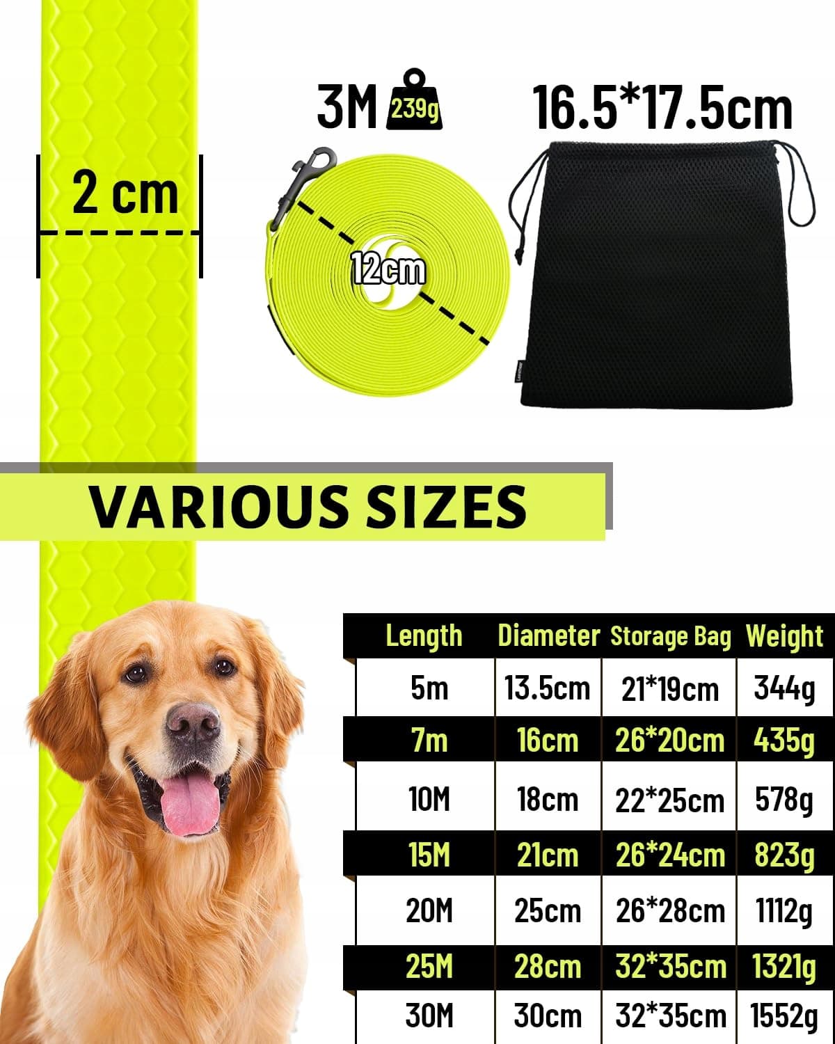 ŁATWA DO CZYSZCZENIA I PRZECHOWYWANIA - Smycz treningowa jest łatwa do czyszczenia i można ją natychmiast po użyciu przetrzeć wodą, aby usunąć powierzchowne zabrudzenia. Ponadto smycz dla psa jest dostarczana z oddychającą siatkową torbą do łatwego przechowywania i przenoszenia