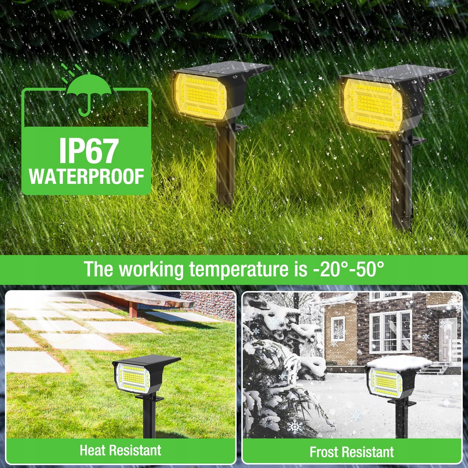 IP67 Wodoodporność: Ta solarna lampa ogrodowa wykonana jest z wysokiej jakości materiału ABS, który jest trwały i może pracować w temperaturach od -20 do 60 ℃. Wodoodporność IP67 sprawia, że solarne reflektory zewnętrzne mogą bez problemu wytrzymać deszcz, śnieg, wiatr, upał i inne trudne warunki atmosferyczne, spełniając Twoje potrzeby oświetleniowe w każdej sytuacji