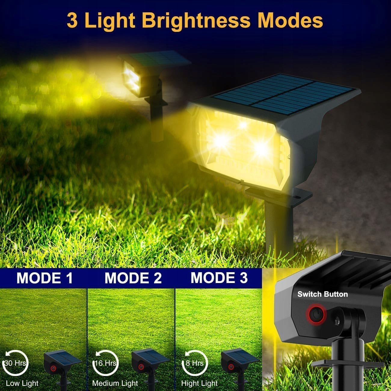 Tryby oświetlenia: Lampy solarne LED do ogrodu są dostępne w 3 trybach światła: tryb słabego światła (30% jasności/30 godzin), tryb średniego światła (60%/16 godzin), tryb wysokiego światła (100%/8 godzin). Panele słoneczne mają funkcję wykrywania światła, lampy solarne do ogrodu automatycznie włączają się o zmierzchu i wyłączają o świcie, bez konieczności ręcznego włączania lub wyłączania.